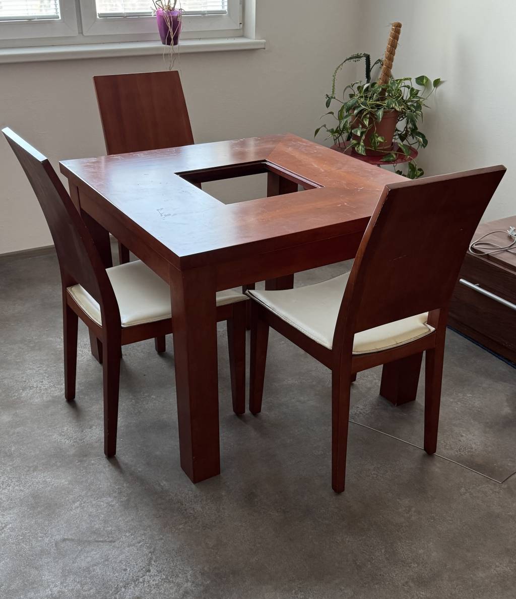 Stav - dle obrázků, jedna židle s potahem se na straně trhá. Nábytek víceméně bez větších oděrek.