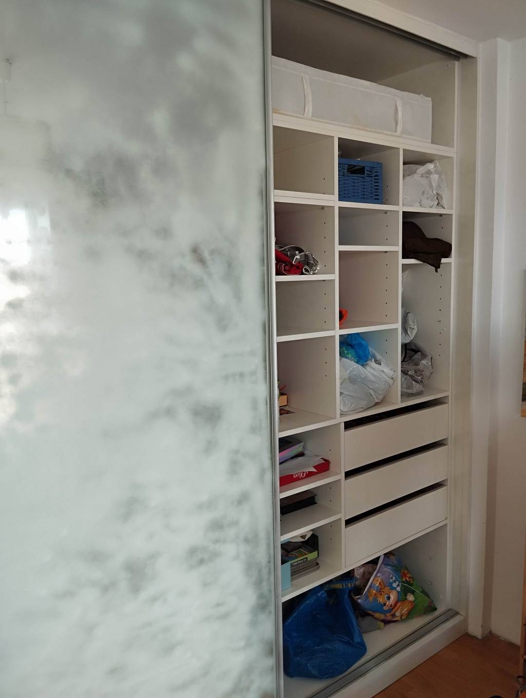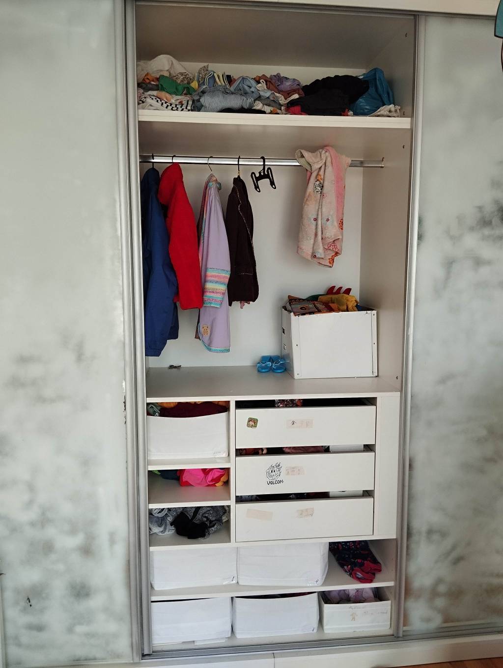 Daruji za odvoz bytelnou, prostornou vestavnou skříň. Rozměry šířka 322 cm, výška 250 cm, hloubka 60 cm + pojezd dveří 9 cm. Skříň má boky i záda a může stát i samostatně. Devře posuvné, zrcadlové, s bílým dekoračním nástřikem, který jde případně odstranit. Nabízím včetně veškerého vnitřního vybavení (police , šuplíky, šatní tyče).