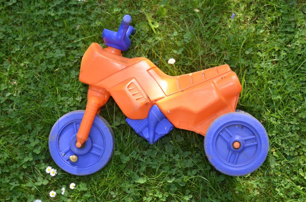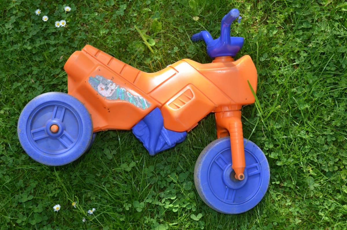 Daruji za odvoz odrážedlo motorka, vepředu jedno kolo, vzadu 2 kola.