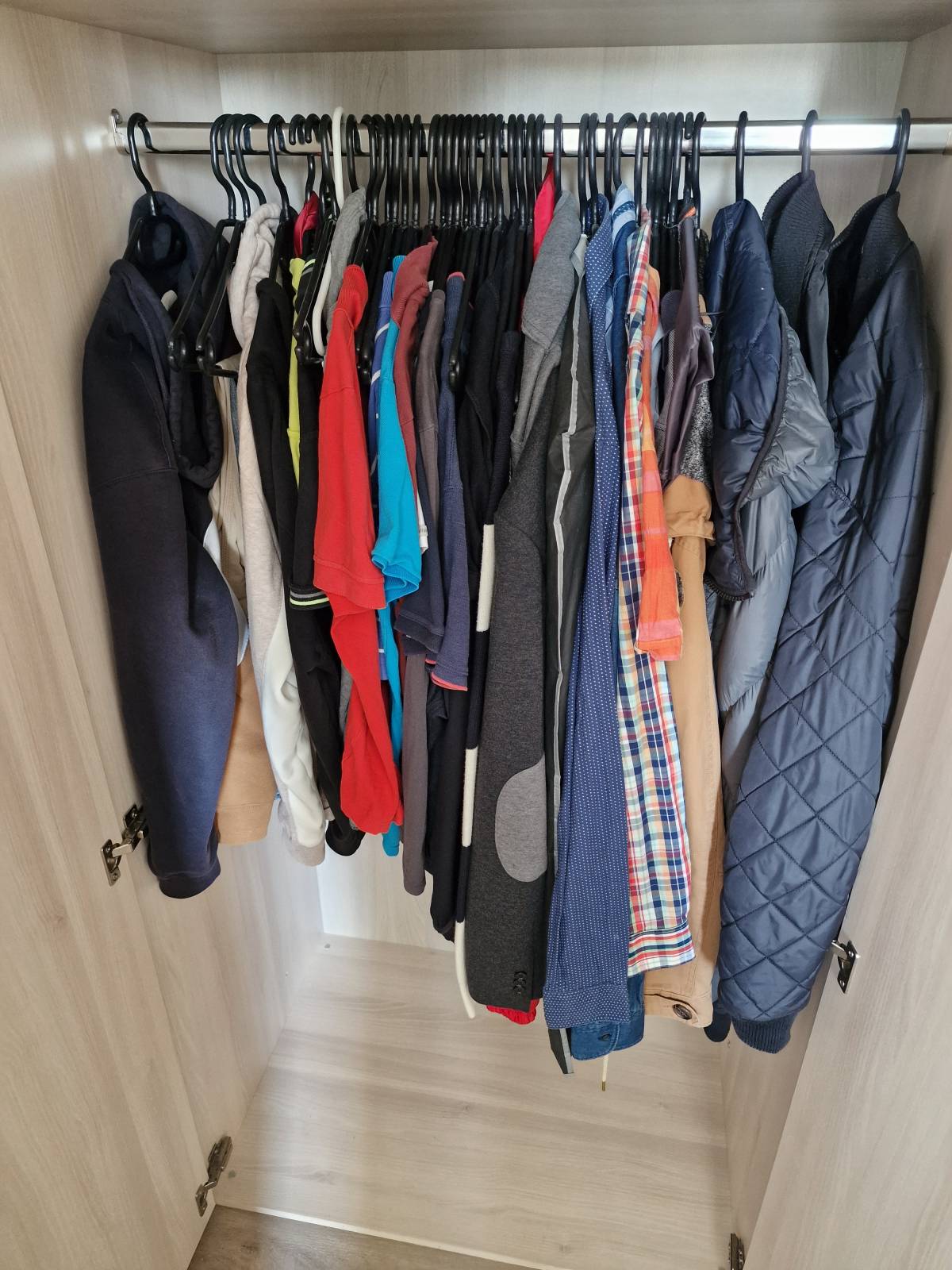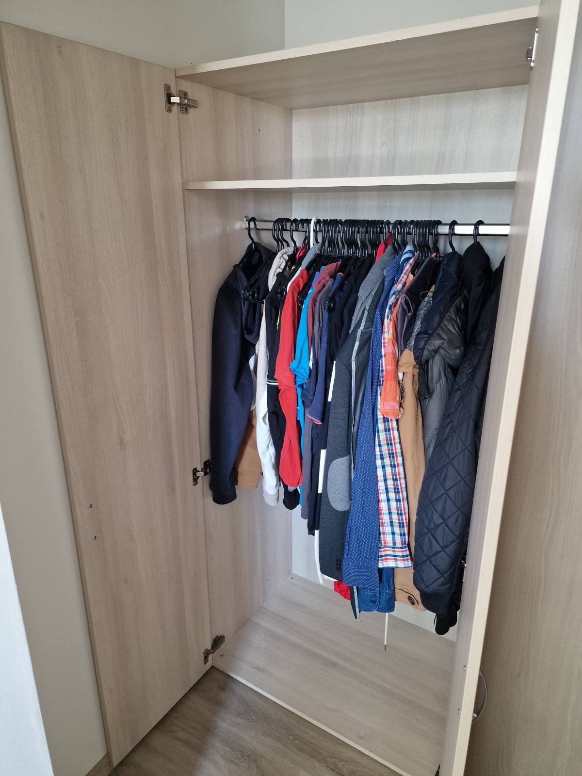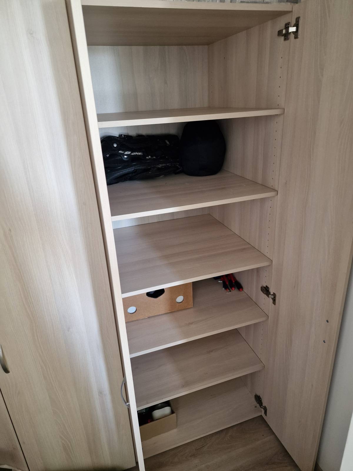 První skříň obsahuje pevně namontovanou polici a šatní tyč pro pověšení oblečení. Druhá skříň obsahuje 5 polic. Velikost mezi jednotlivými policemi jde měnit.