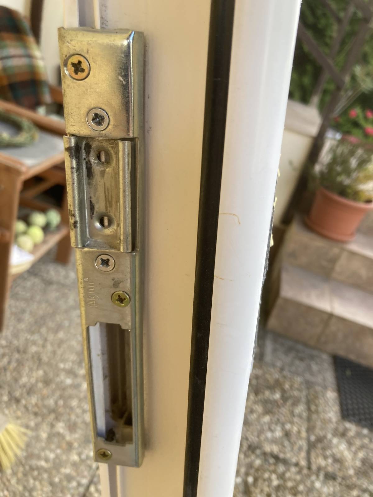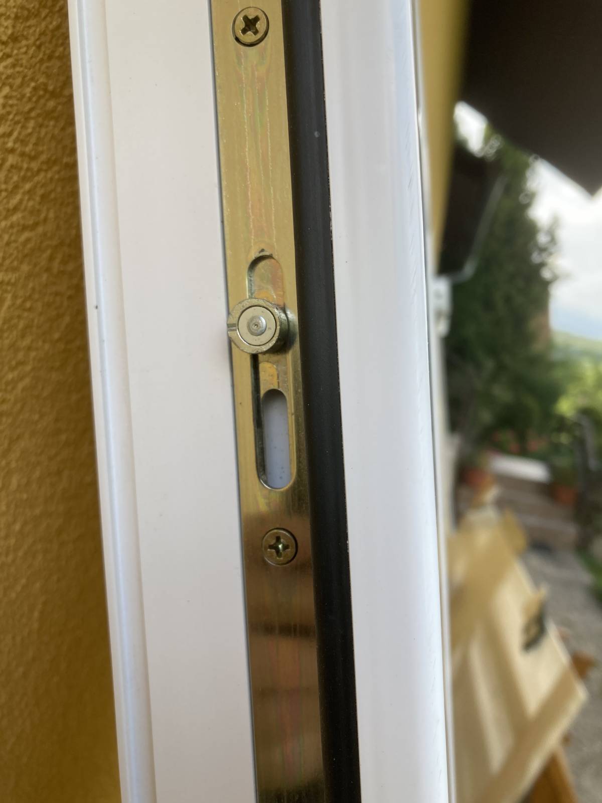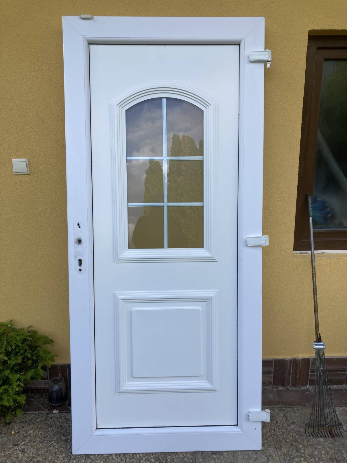 Bílé, plast, včetně zárubní. Konstrukce jako u plastových oken. Dvojité zasklení. Na třech pantech, zamykání kromě centrálního jazýčku další čtyři kotevní místra. Bez klik, včetně zámku bez vložky.