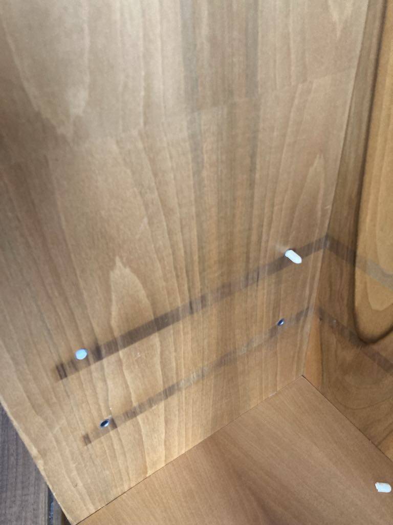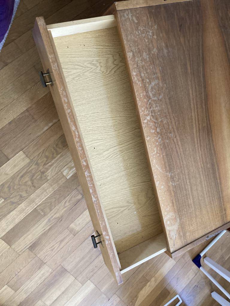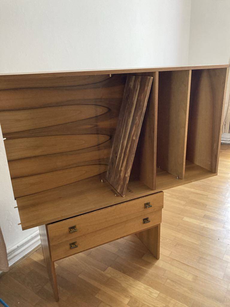 Daruji za odvoz tuto policovou skříň se šuplíky. Je hezká, ale nehodí se mi. Bohužel jsem ji trochu poničila vodou. Nutný vlastní odvoz, je to těžké, druhé patro bez výtahu, určitě to chce dva lidi. Na první fotce je rozložená a horní část položená vzhůru nohama. Jedna z polic je přidaná - nemá stejný vzor. Bohužel se mi při sundávání povedlo ulomit jednu ze zarážek na polici, ale určitě půjde pořídit levně jinou. Skříňka je bytelná, jen záda a vnitřek šuplíků má lamino.