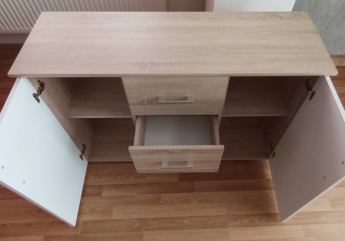 Odstín dub sonoma, dvěře bílé. Šuplíky možno vyjmout.