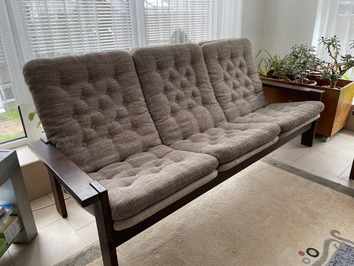 Dřevěné rámy, čalounění v dobrém neporušeném stavu. Polstrování v renovovaném stavu, na sedacích soupravách jsou známky užívání, ale žádné větší poškození. Na křesle na opěradlech viditelné známky užívání.
