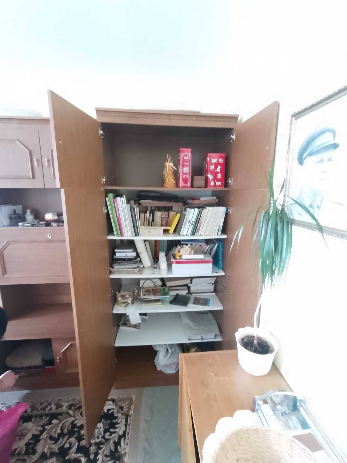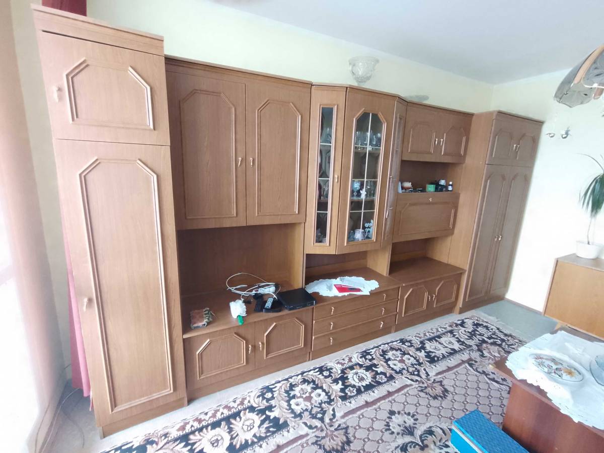 Daruji za odvoz nábytkovou stěnu v pěkném stavu. Celkové rozměry všh 207x407x49,5cm. Stěna se skládá z 5 vertikálních dílů. Vlevo je úzká dvojskříň s policemi všh 207x44,5x45,5. Úplně vpravo je šatní skříň se skříní nad ní, která byla předělána na knihovnu s policemi všh 207x90x51. Prostřední 3 díly jsou tvořeny z dolní části dvou skříněk a jedné komody a horní skřínky, skleníku a kořalníku se skříňkou. Rozměry prostředních spodních částí všh 52,5x90x50.