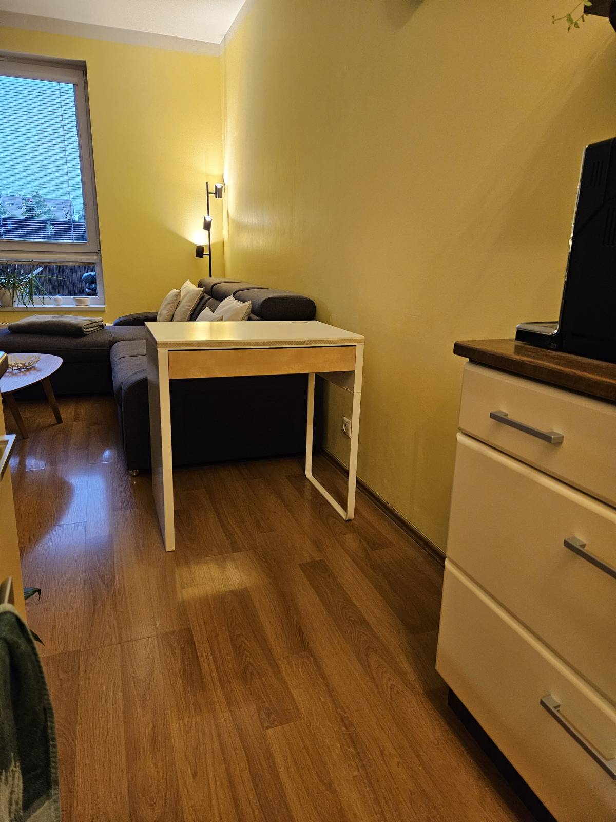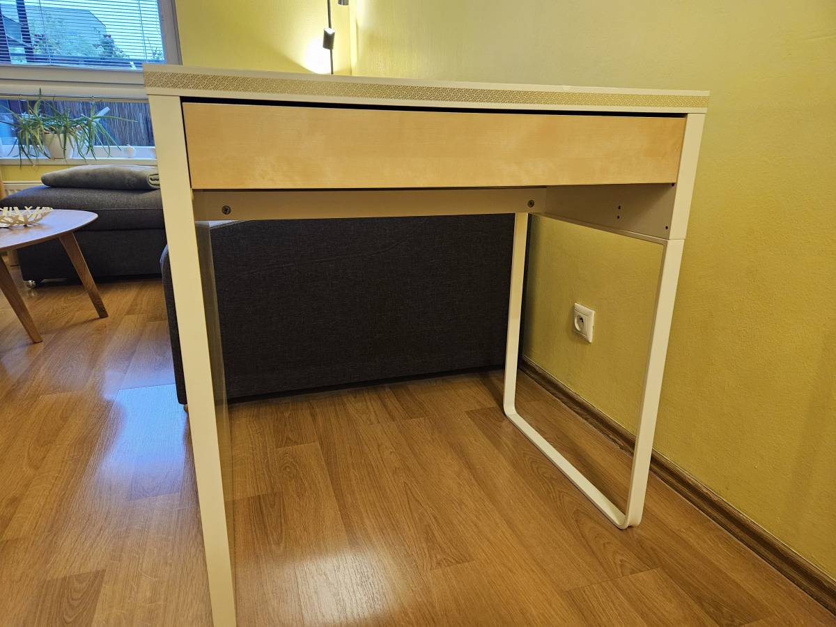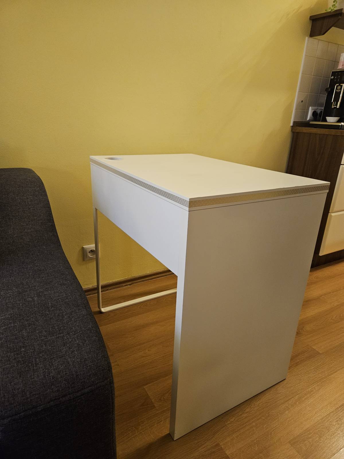 Daruji za odvoz psací stůl Ikea MICKE, bílá, 73x50 cm. Je stále ve velmi dobrém stavu. Na horní desce je nalepená nová folie. Po notebooku jsou na ní čtyři tmavší místa (lze opět přelepit novou fólií). Šuplík má barvu břízy. Stůl plně funkční, pevný. Po obvodu nalepená dekorační japonská páska, lze beze zbytku sundat.