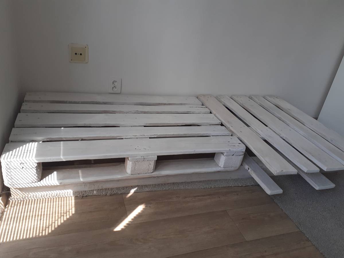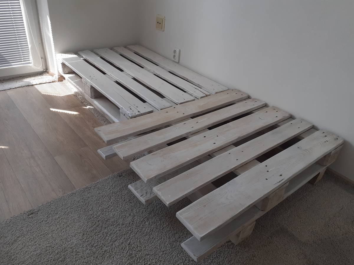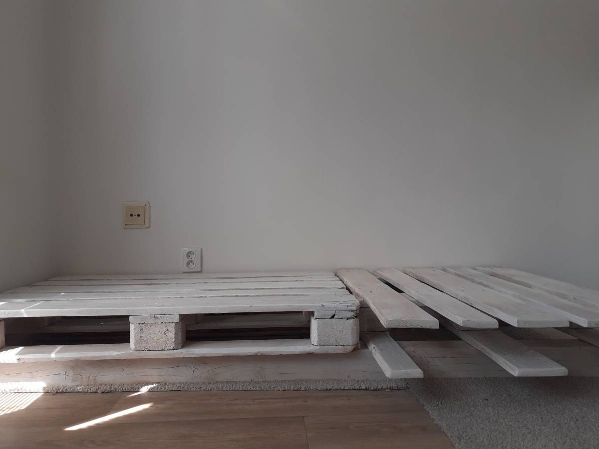 Postel z palet, kterou tvoří dvě dřevěné palety a dva dřevěné trámy, na kterých jsou palety položeny. Nabízím za odvoz. Místo předání v ulici Svatopluka Čecha v Brně-Králově poli.