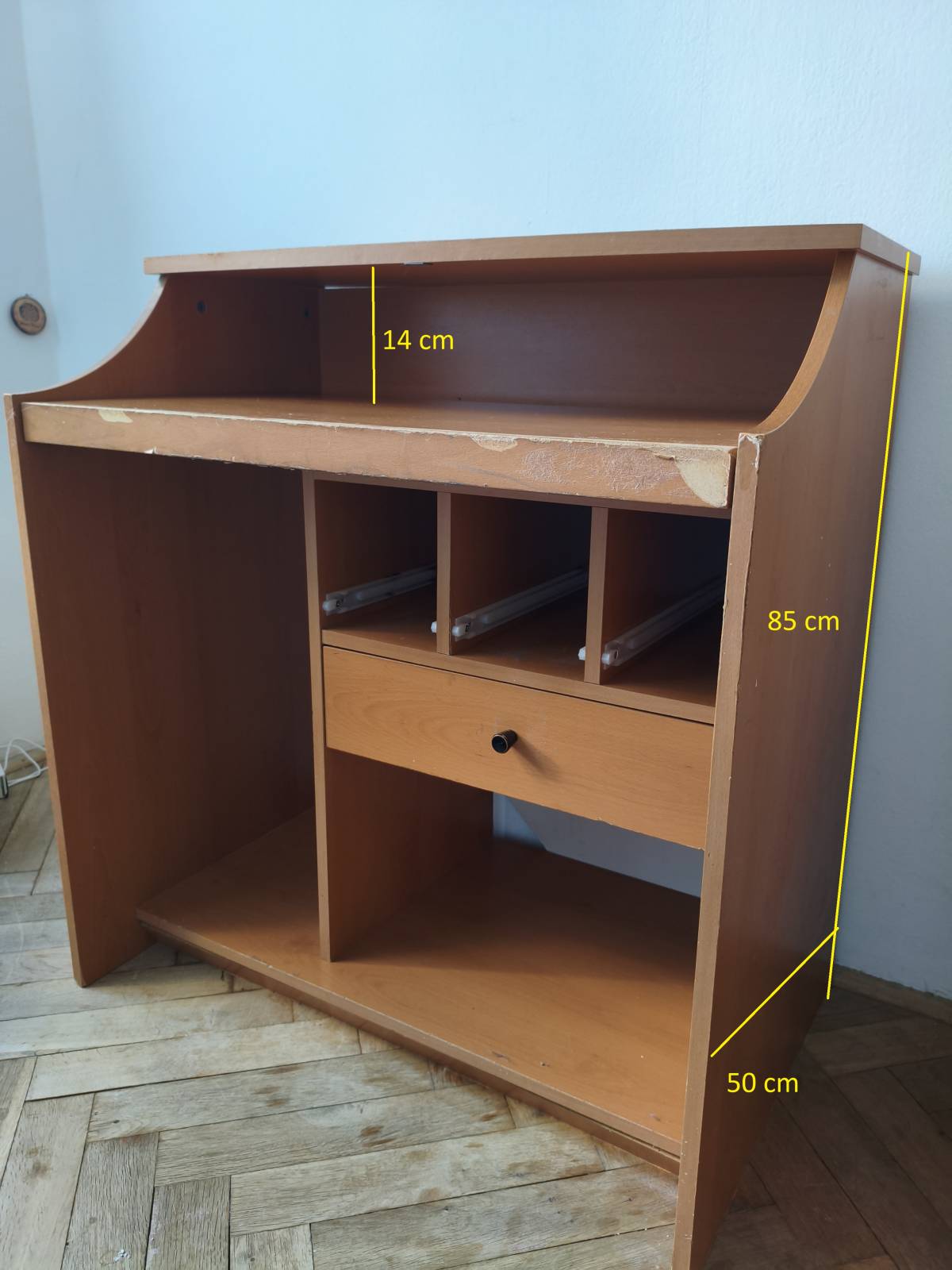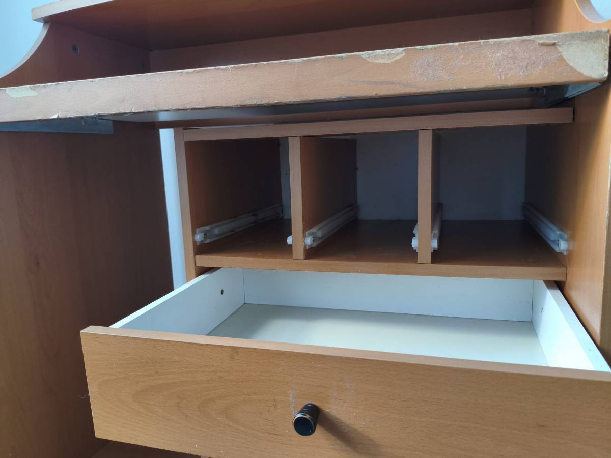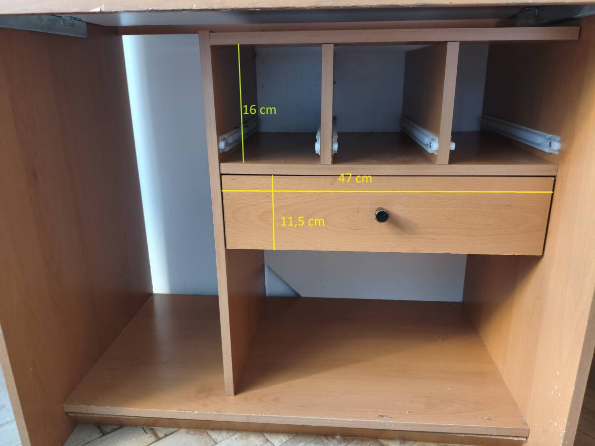Darujeme pracovní stůl se zjevnými vadami. Rozměry u jednotlivých fotek. Prostřední deska výsuvná (vysouvací mechanismus drhne).