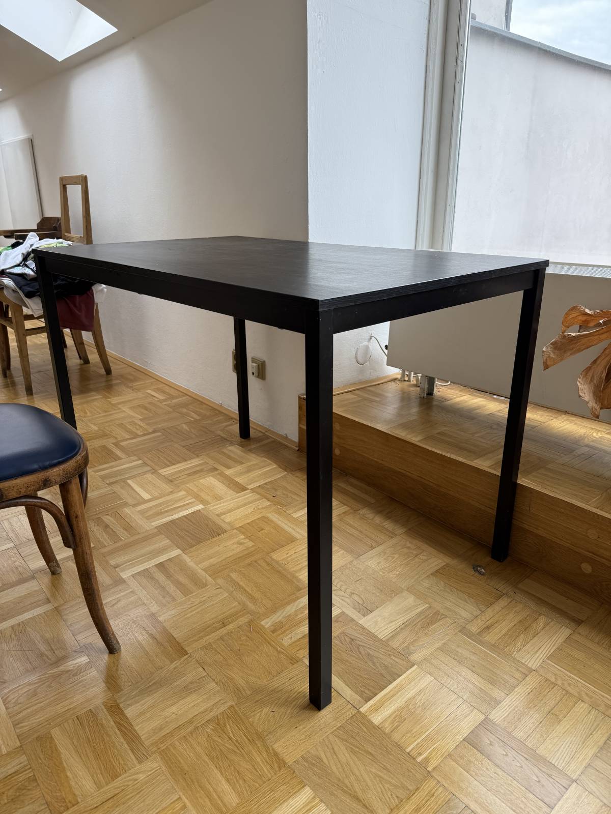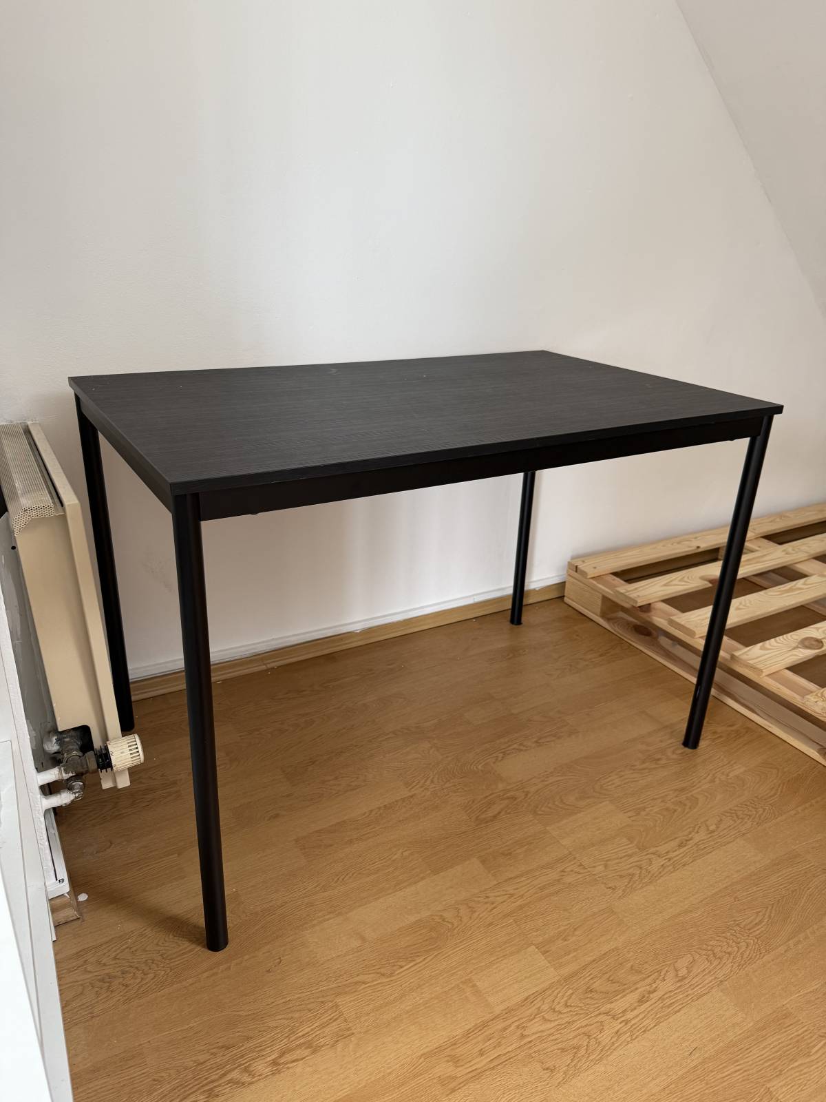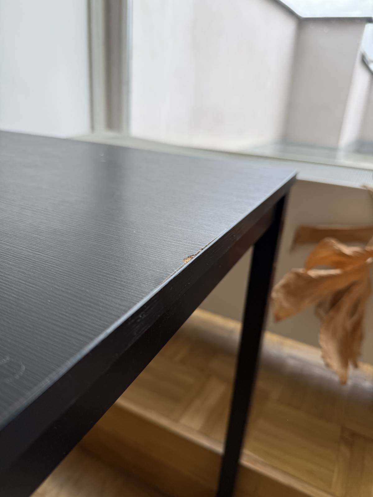 Daruji za odvoz tři černé psací stoly z IKEA, jednoduché, imitace dřeva. Dva jsou stejné s kulatýma nohama, jeden s hranatýma z dřívější kolekce. Jeden z těch kulatých je mírně poškozen, zatekla pod desku voda, tak je zčásti nazvedlá dýha, ale dá se na něm normálně fungovat.