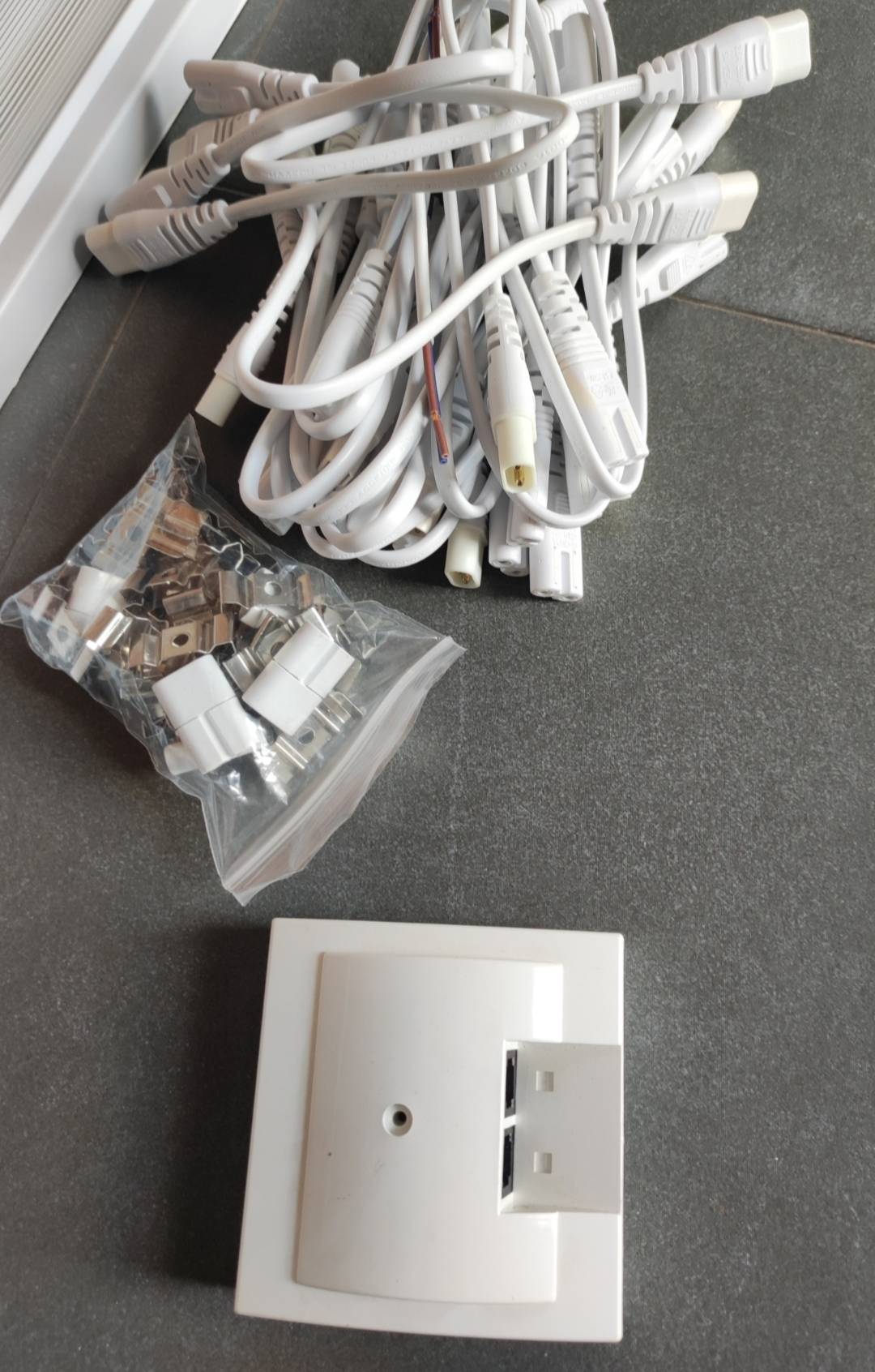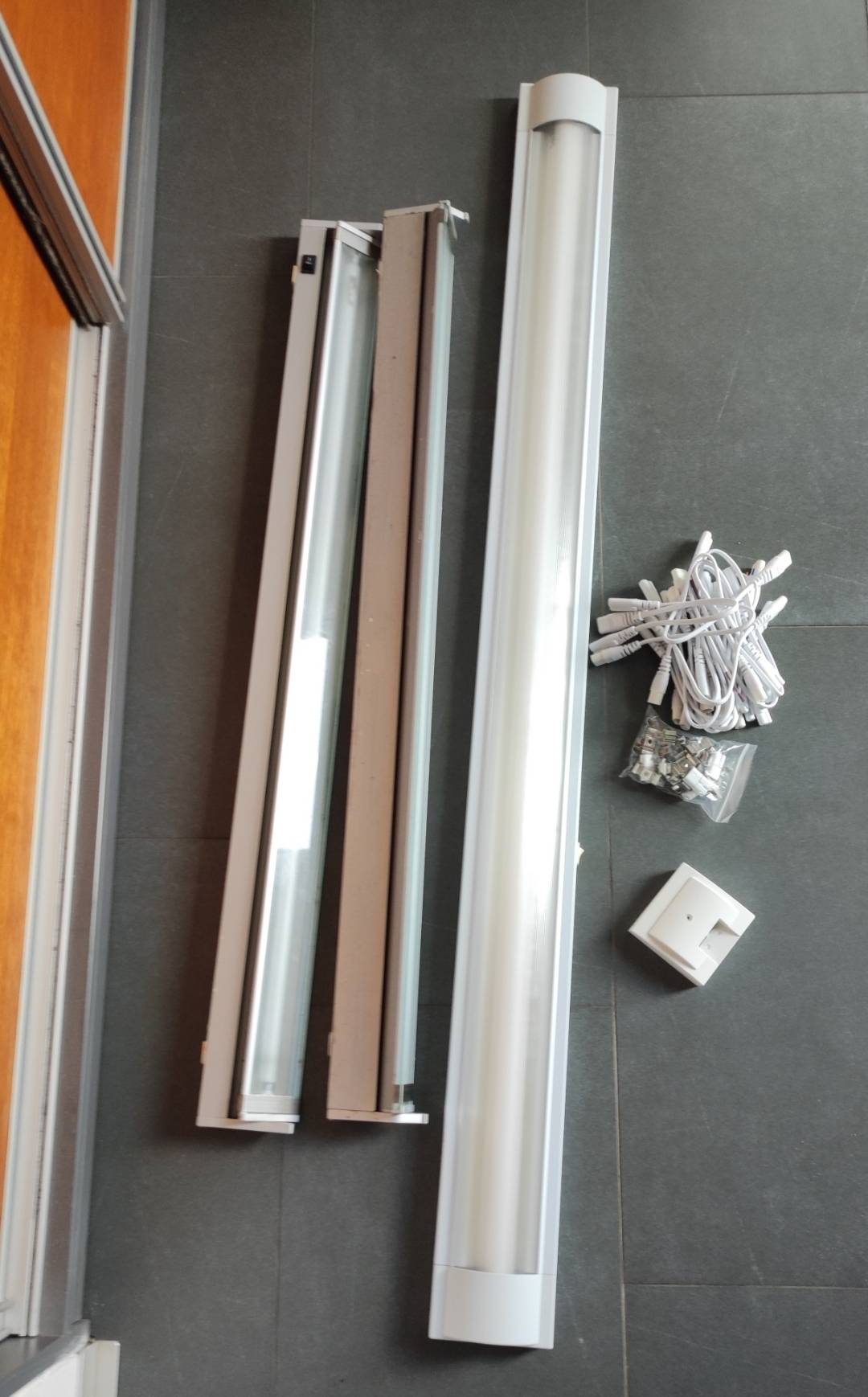 Daruji za odvoz. Nutno koupit nové zářivky (ty už nesvítí). Délka světel cca 91 cm (2 ks stříbrné) a 124 cm (bílé) + směs drobného elektra.