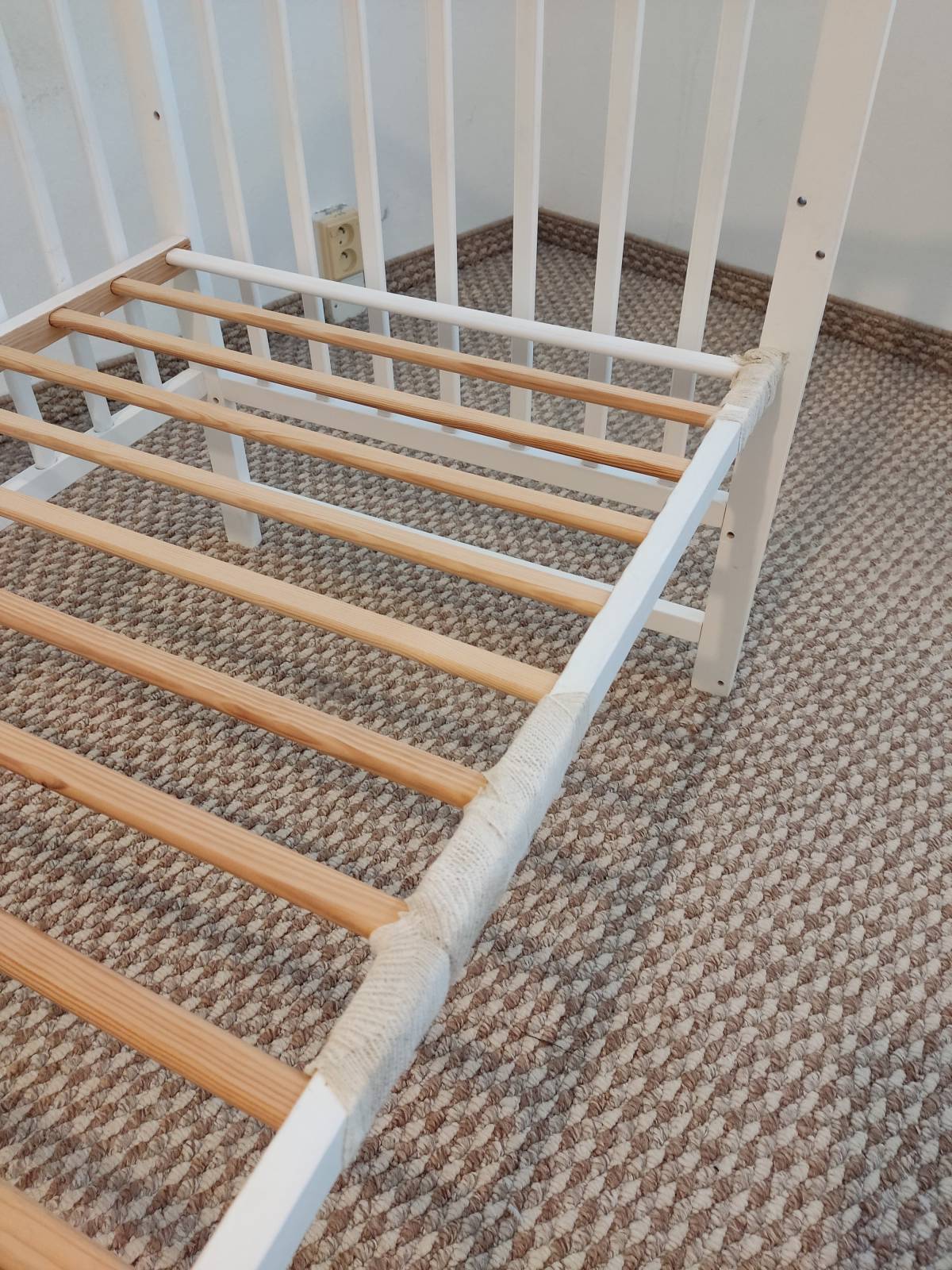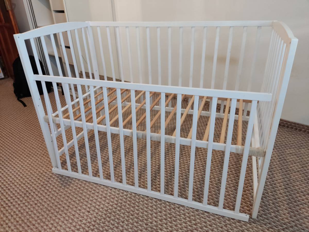 Daruji za odvoz dětskou postýlku. Pozor, má zlomený rošt. Je trochu opravený, ale nejde takto polohovat, používali jsme jej raději ještě podepřený. Po výměně či opravě roštu funkční. Na obrázku má odmontovanou bočnici, máme komplet komponenty pro složení.