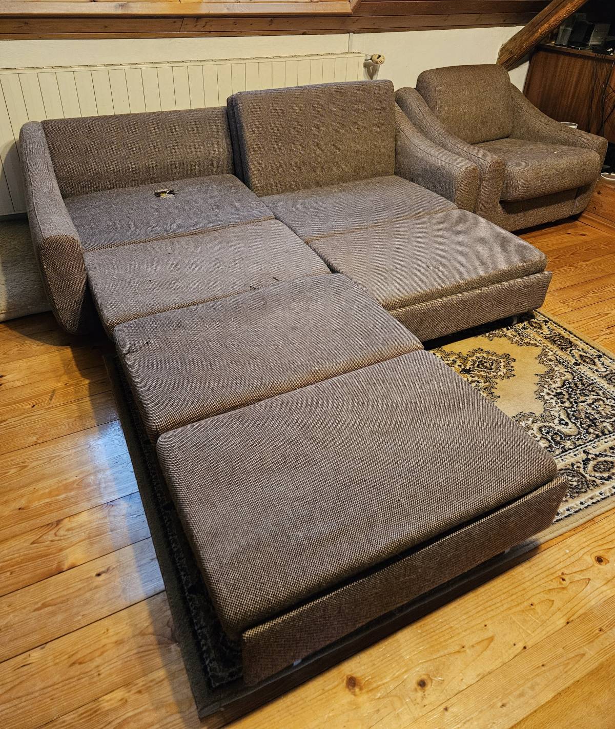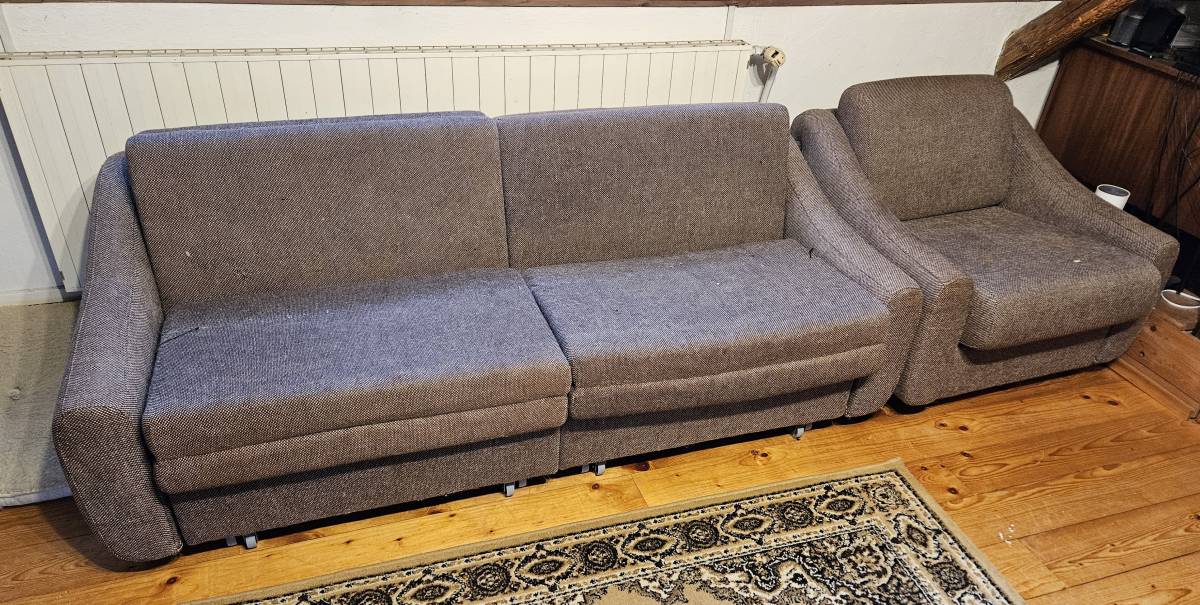 Pohovka 185x85 cm, křesla 86x90 cm. Velmi stará, kovová konstrukce, potah potřebuje vyměnit. Po rozložení dvě lůžka široká 78 cm.