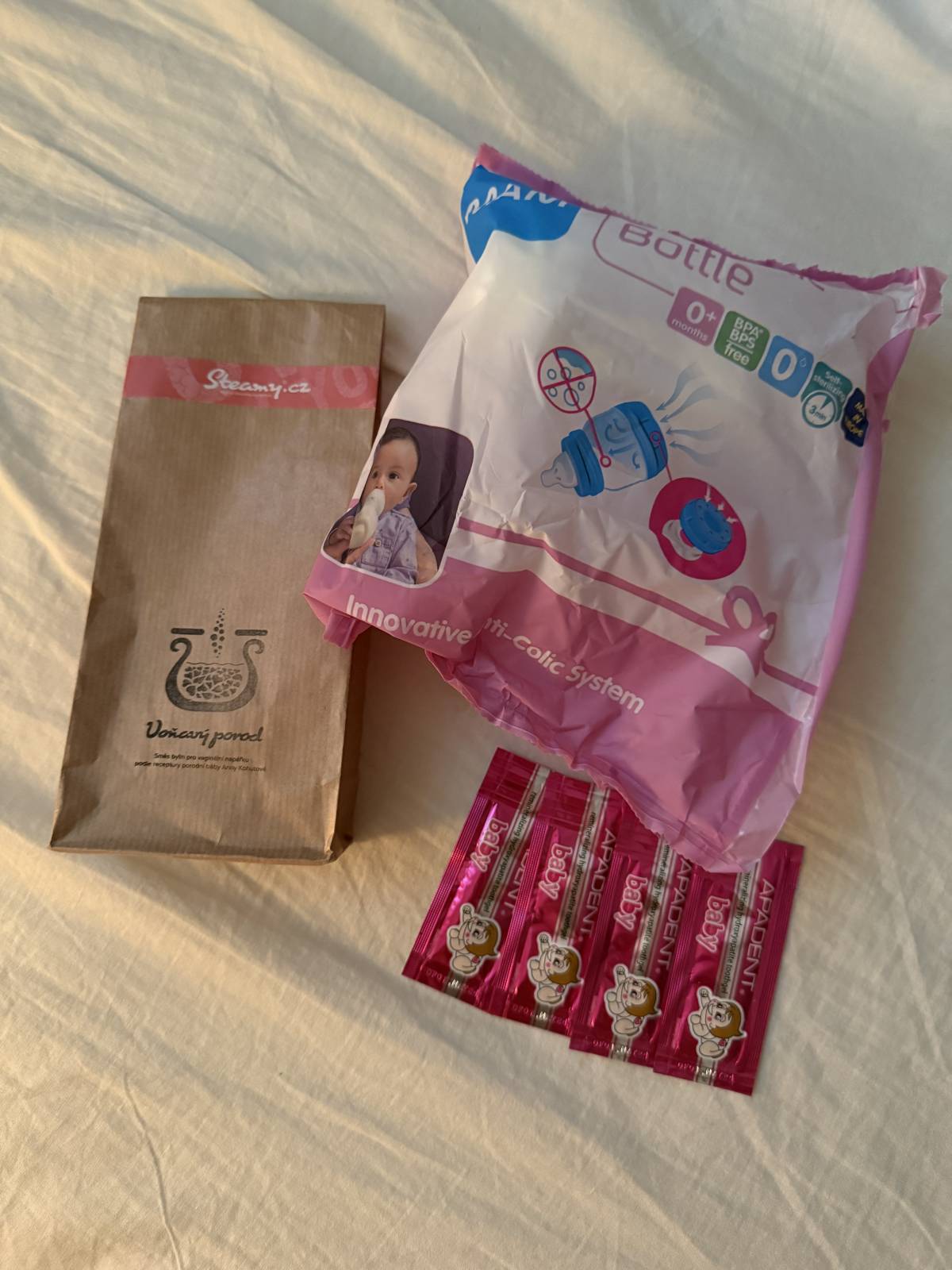 Daruji za odvoz bylinnou napářku k porodu, lahvičku, remineralizační gely vzorečky, knížky