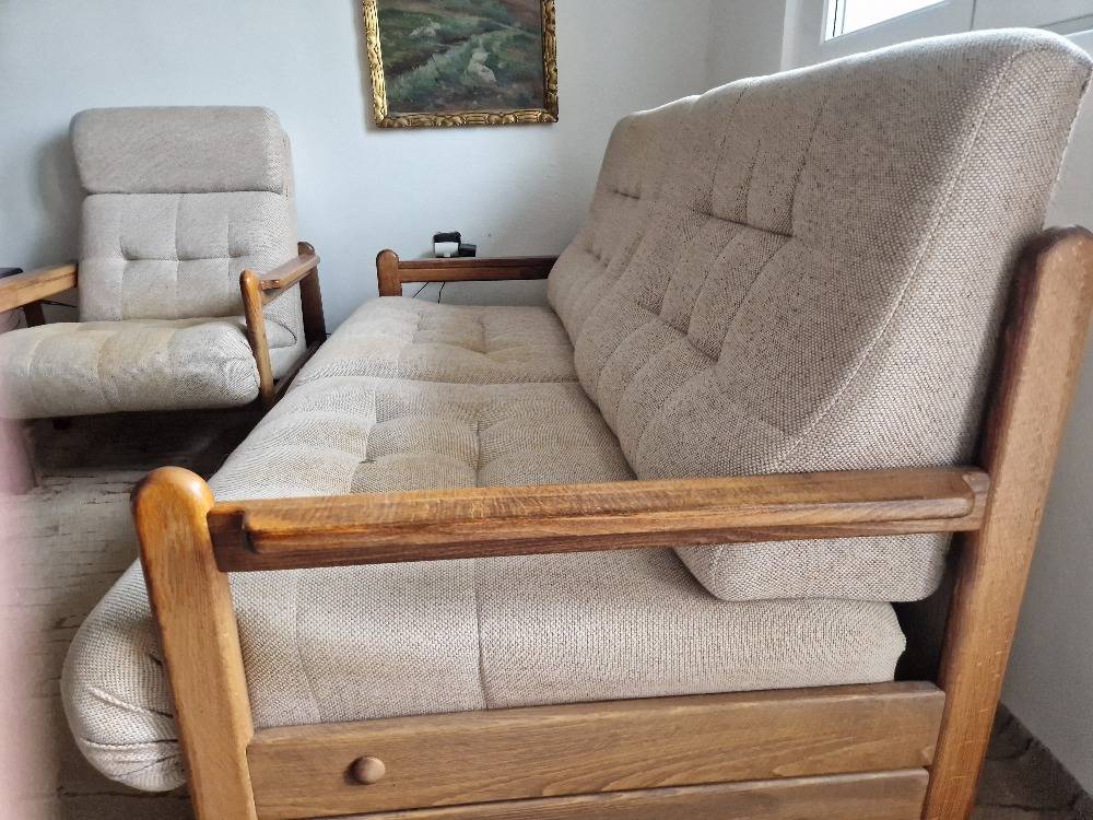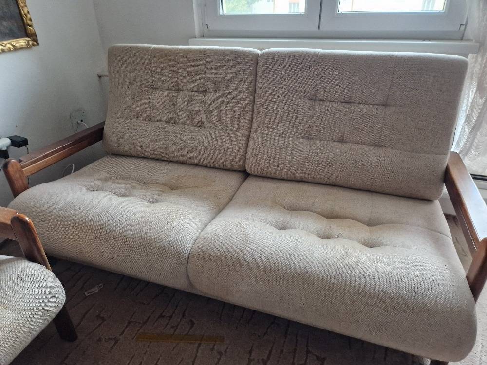 Daruji velice pohodlný světlý rozkládací gauč + 2 křesla + 2 taburetky. Nutné přečalounit.