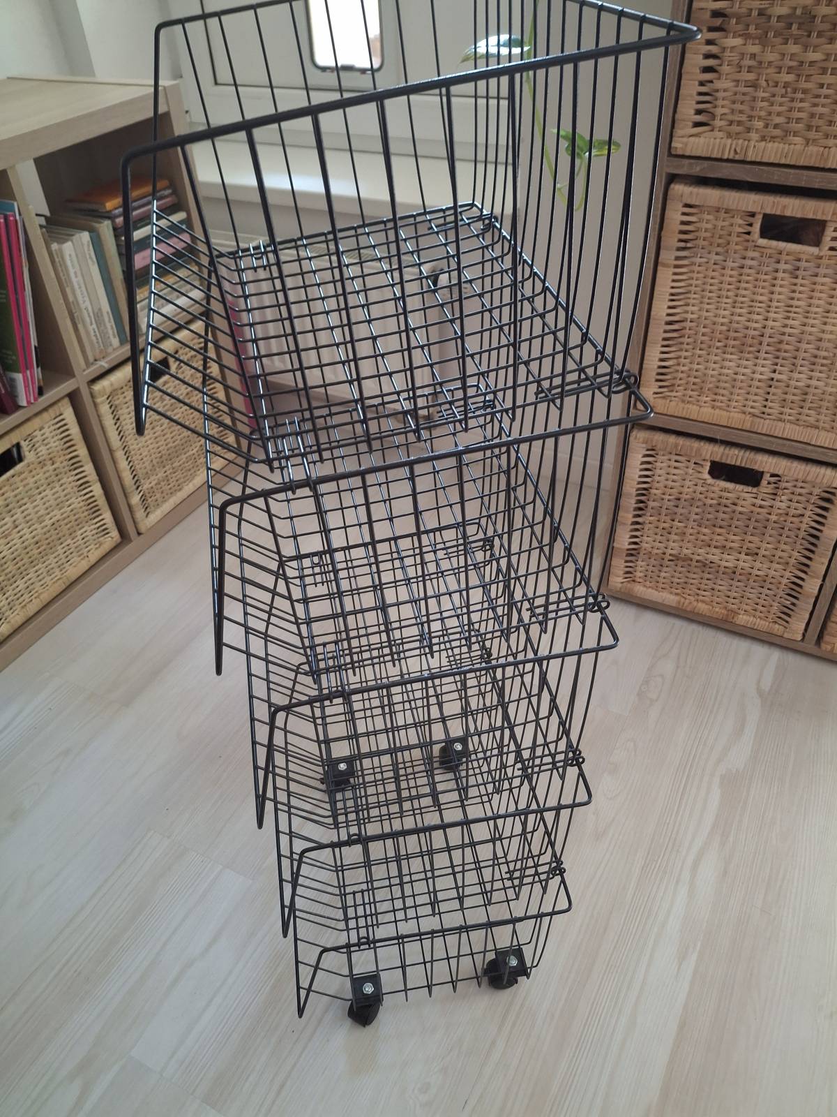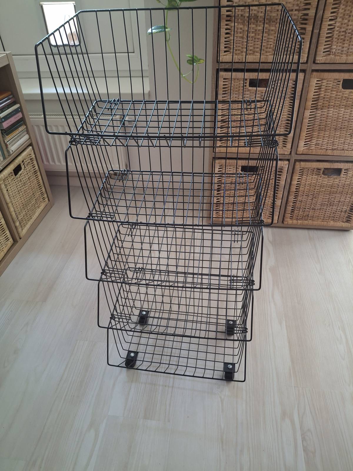 Daruji za odvoz drátěné košíky, na kolečkách. Barva černá, výšku lze upravit odejmutím košíku. Výška s pěti košíky je 97 cm, hloubka 30 cm, šířka 41 cm. Jen osobní odběr v Praze Malešicich.