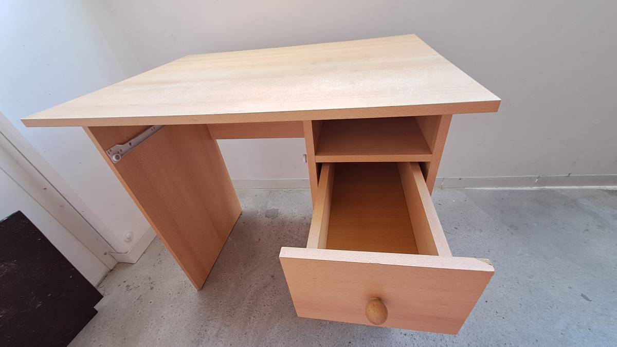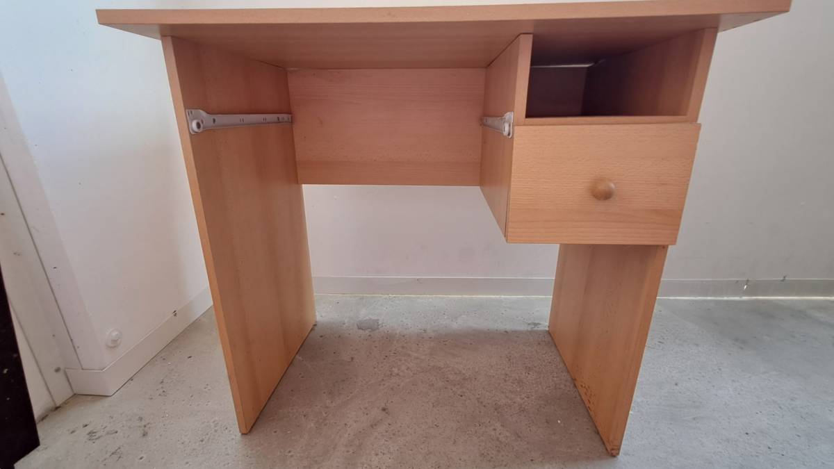 Daruji za odvoz dva psací stoly (stejné) v dekoru buk. Jsou již starší, tomu odpovídá i stav horní pracovní desky nebo místy odlouplá dýha. Spojení desek bylo jen dřevěnými kolíky, takže se „rozpadají“ (což je možná výhoda pro transport 😉), ale není to nic, co by nespravilo lepidlo nebo vruty. Jednomu ze stolů (na fotce) chybí spodní deska na klávesnici. Šířka 80 cm, hloubka 58 cm, výška 74 cm. Osobně k převzetí tento týden do 24.7. v Jihlavě.