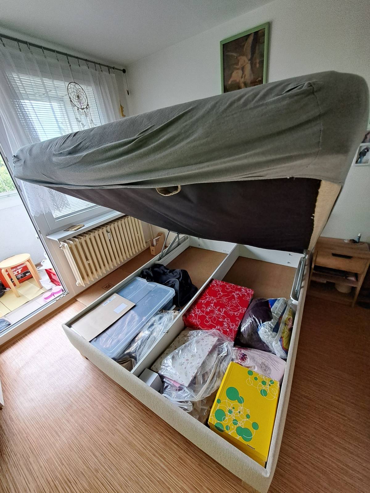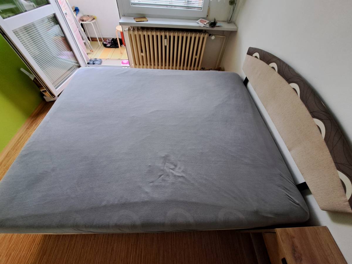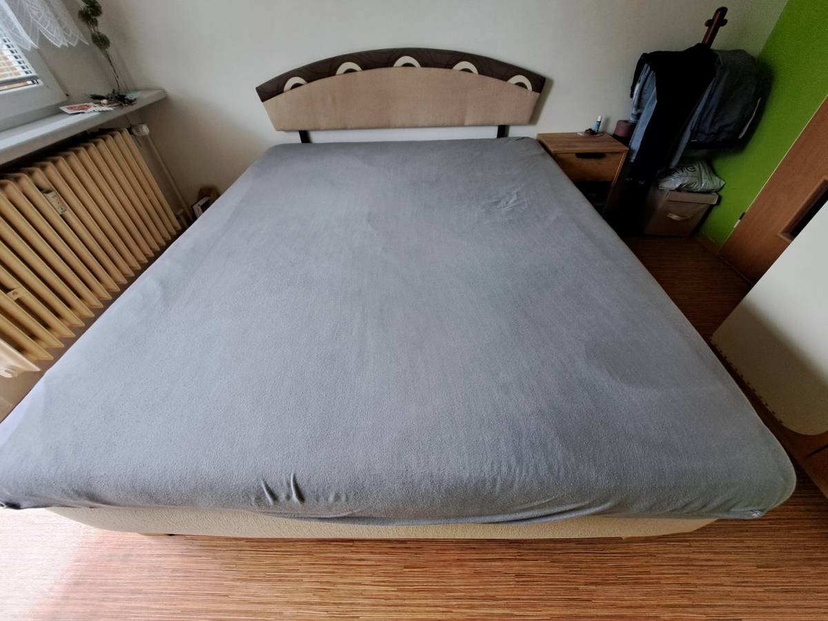 Daruji za odvoz manželskou postel-dvoulůžko české výroby o rozměrech 160cm x 200cm, výška ložné plochy je 56 cm. Postel má velký úložný prostor.