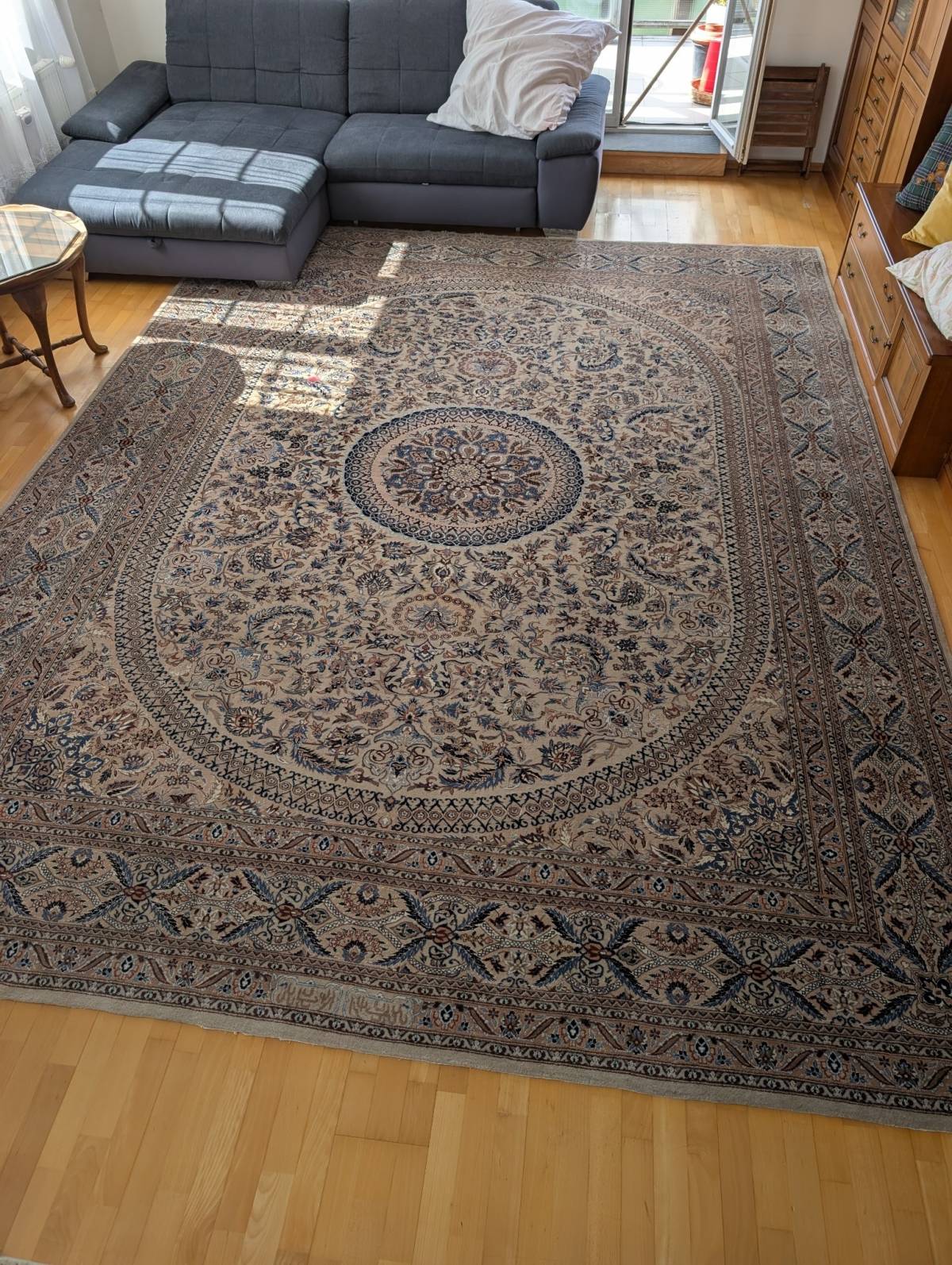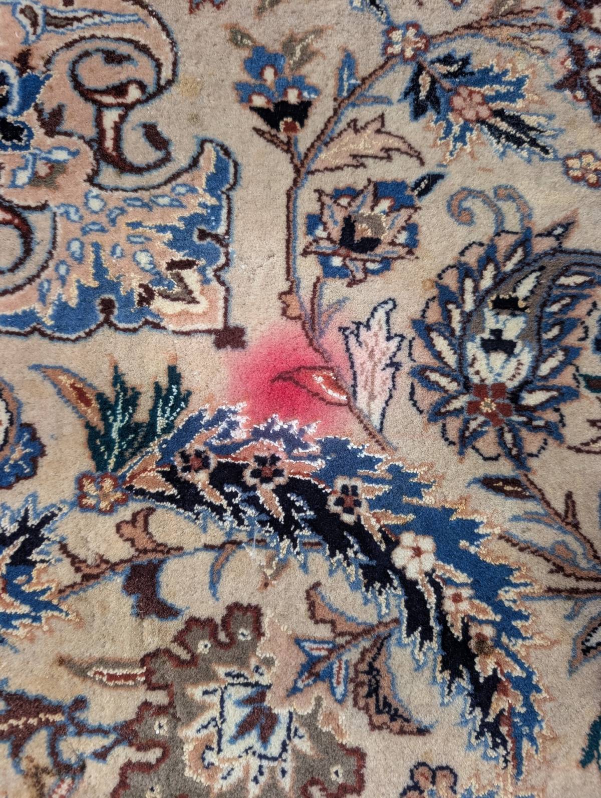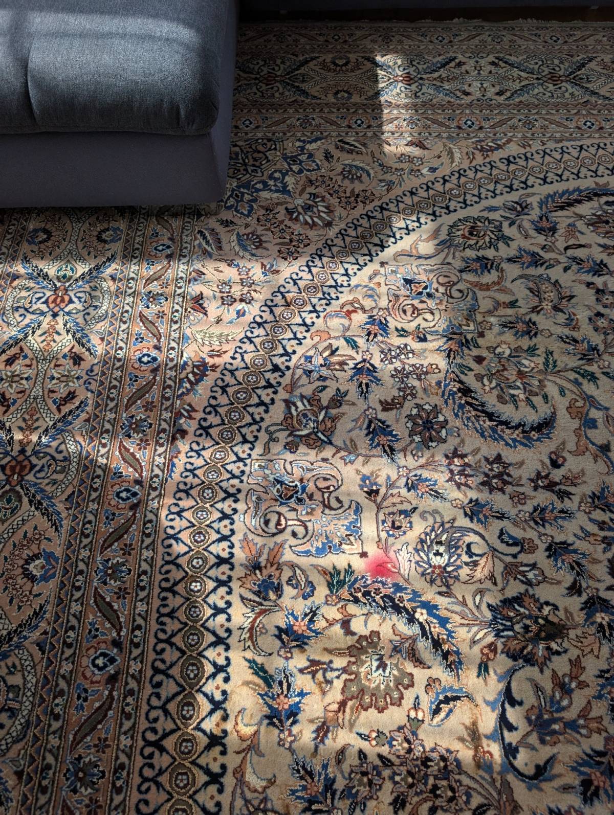 ma cerveny flek 87 cm od delsi strany a 147 cm od kratsi, idealne se schova pod nabytek - viditelne na fotce tam, kde sviti slunicko oknem