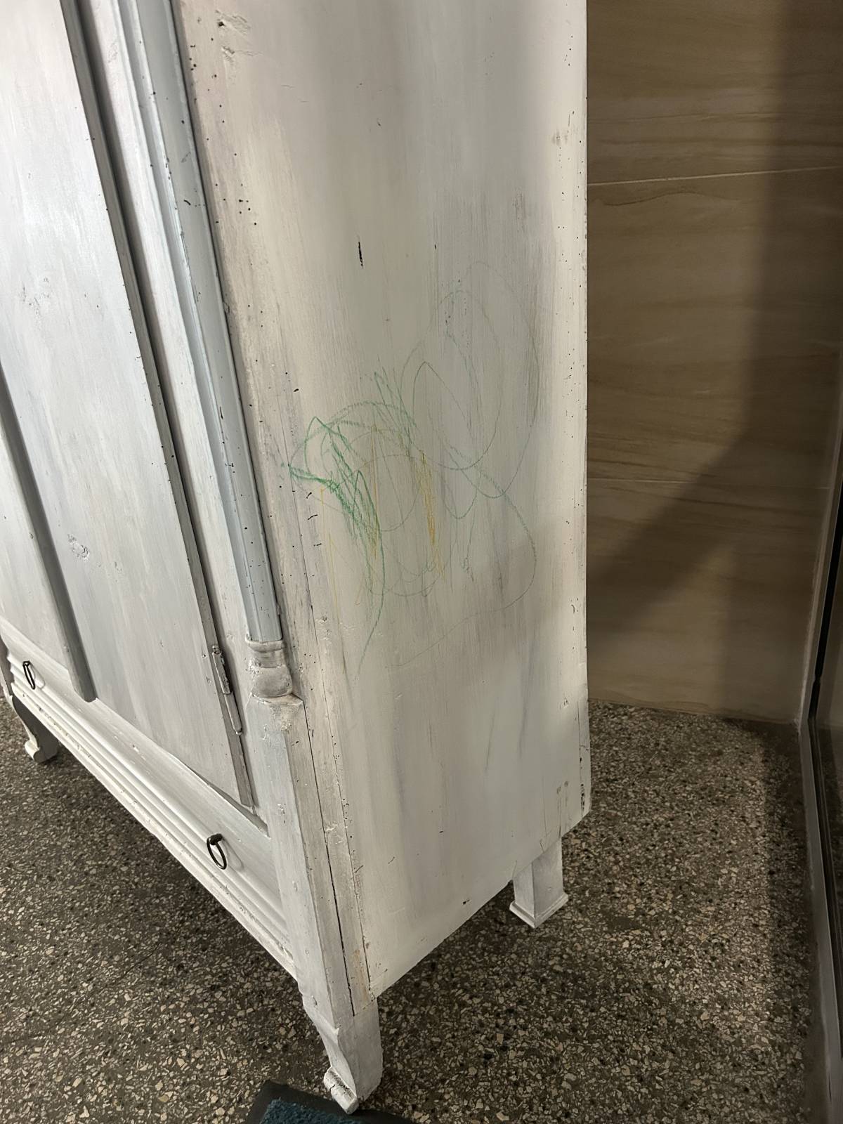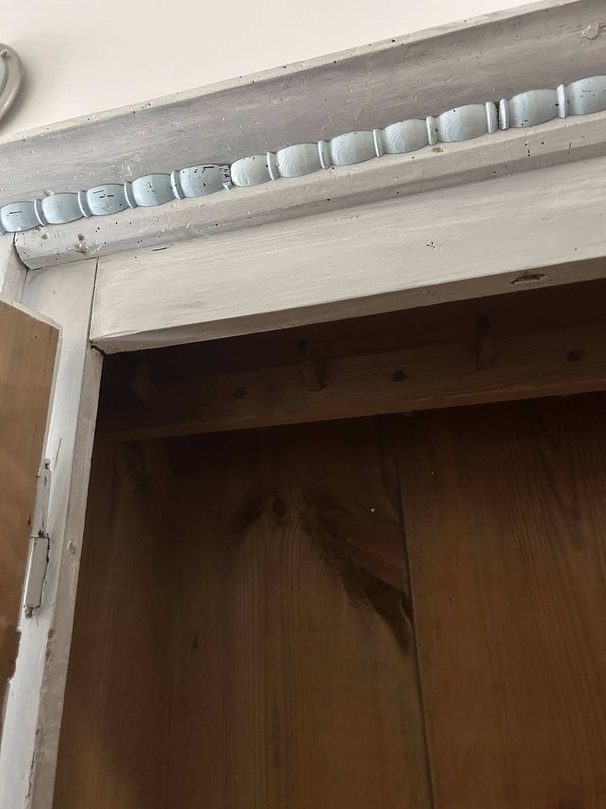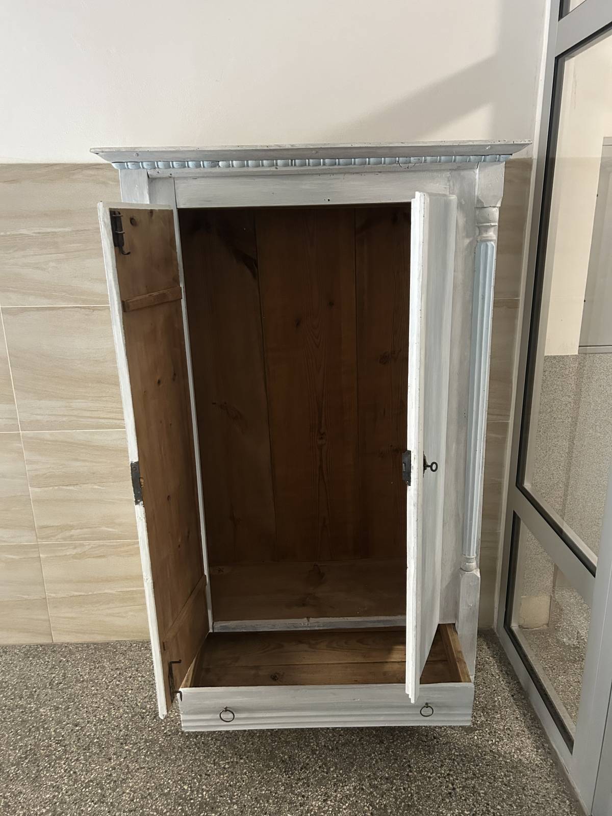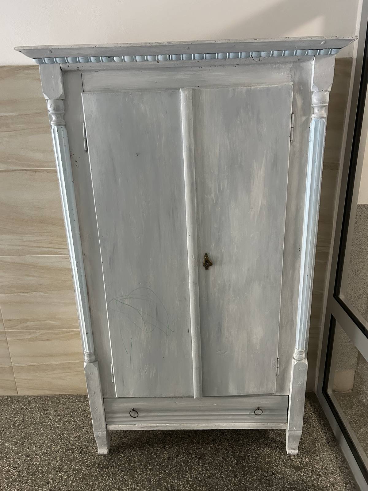 Daruji za odvoz starou skříň (určitě více než 100 let). Bohužel ji děti použili pro malování, viz fotky. Skříň byla v minulosti napadena červotočem, ale byla ošetřena a červotoč zahuben, nicméně jsou na ni dírky. Uvnitř jsou háčky na zavěšení kabátů, bund, apod.