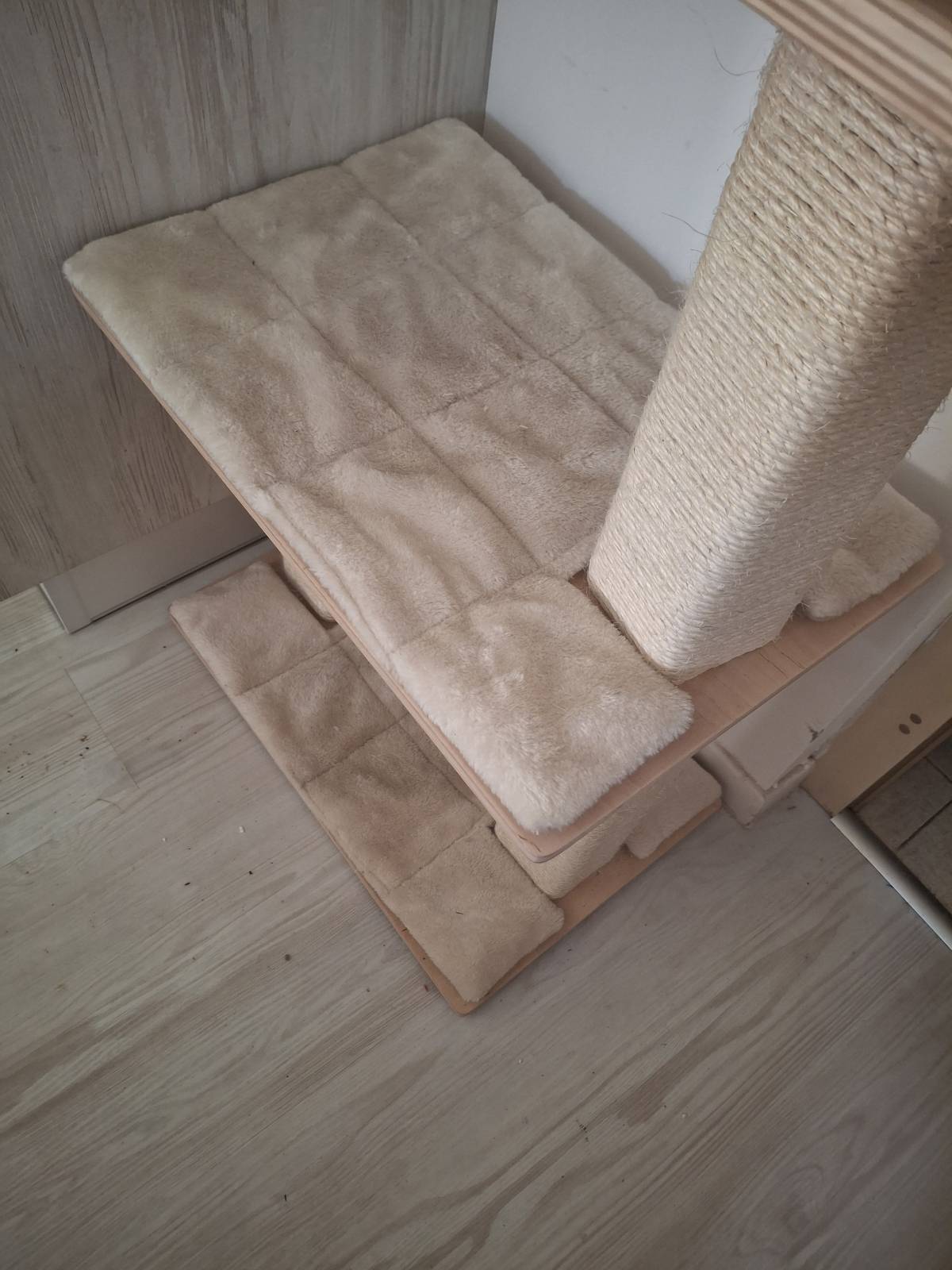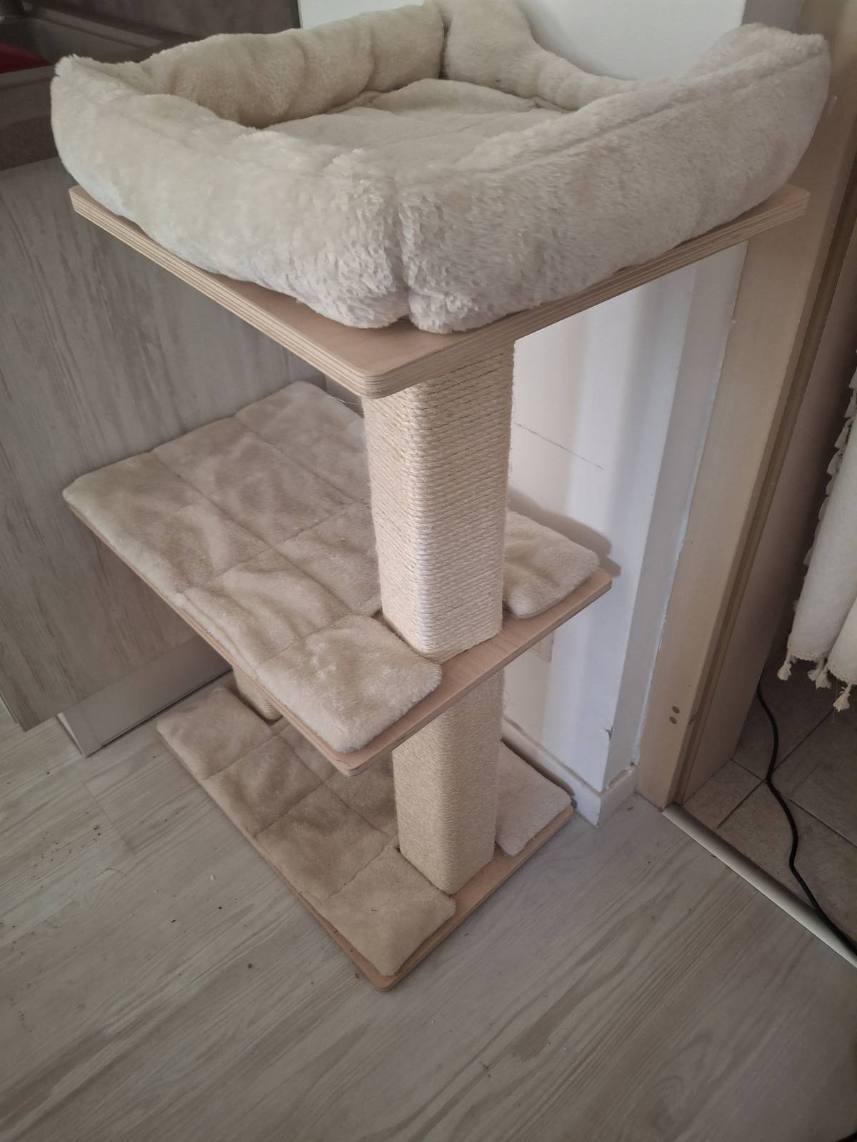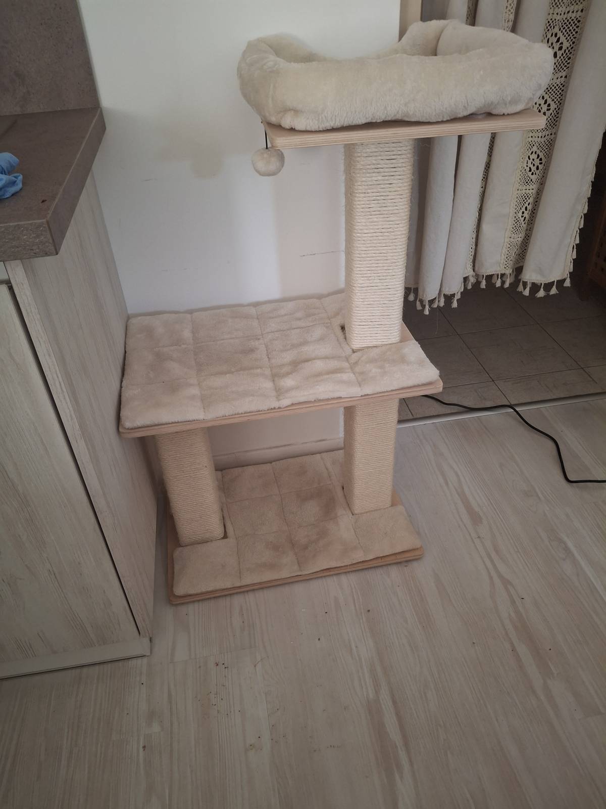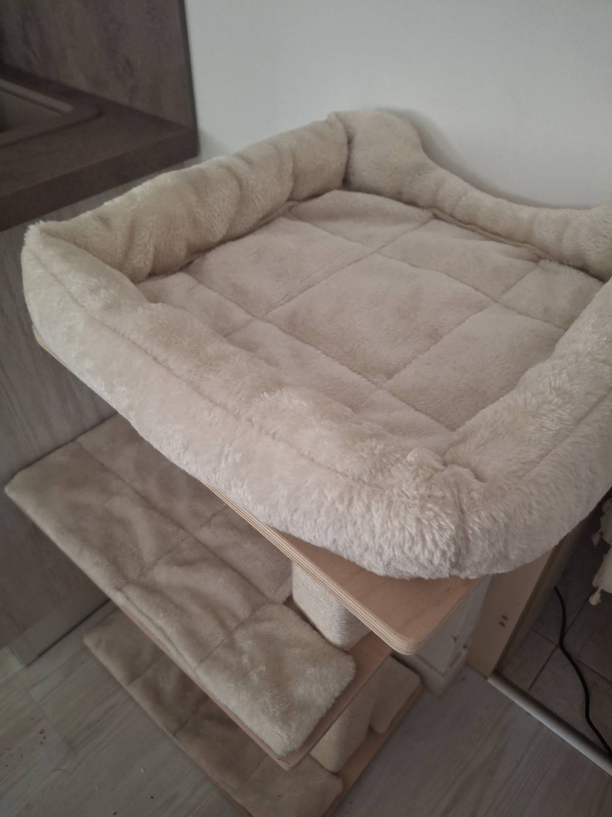 Daruji za odvoz škrabadlo. Barva hnědá, materiál dřevo, poležení béžové z nějaké chlupatiny, upevněné suchými zipy. Výška 102 cm, dvě spodní plochy jsou velké 58 x 38 cm. Celkově je škrabadlo široké 67 cm a 38 cm hluboké.
