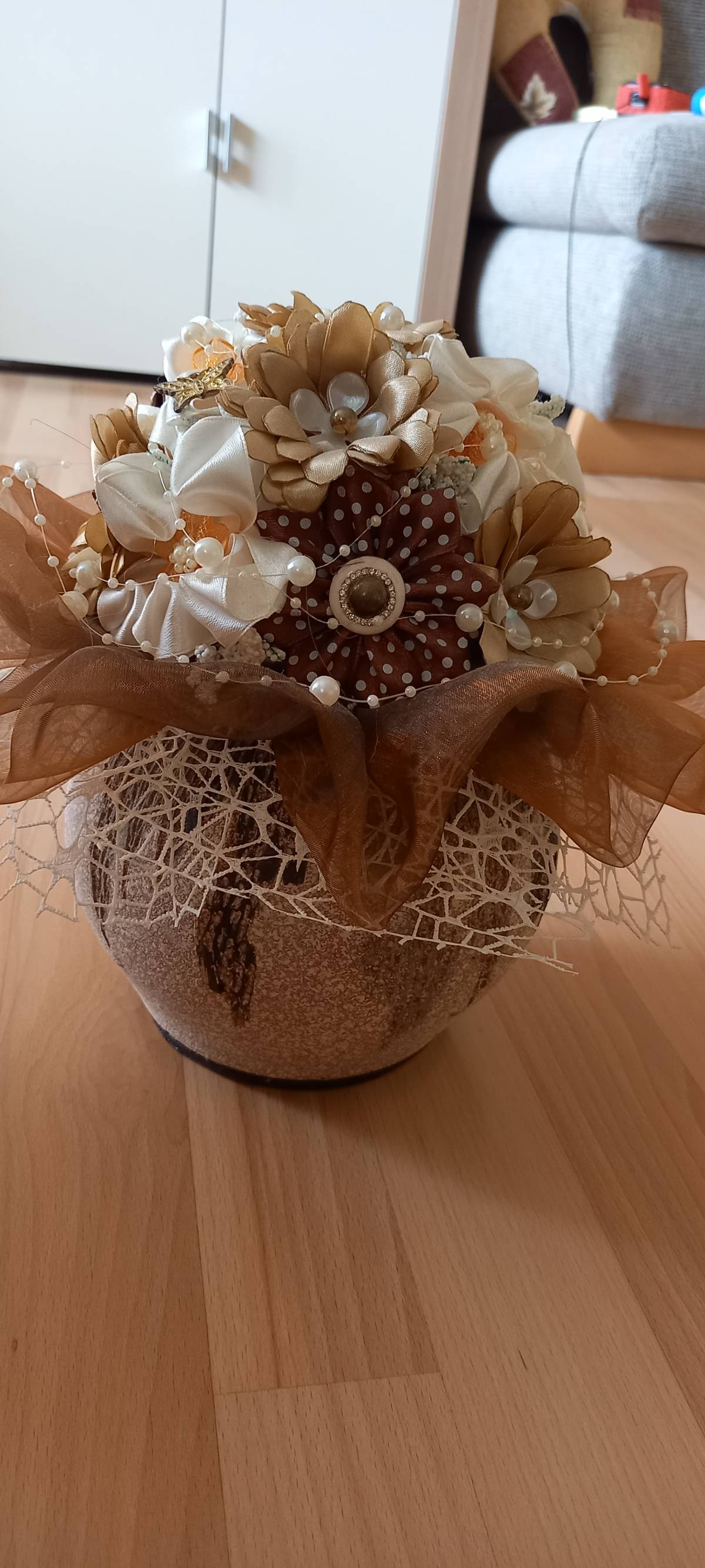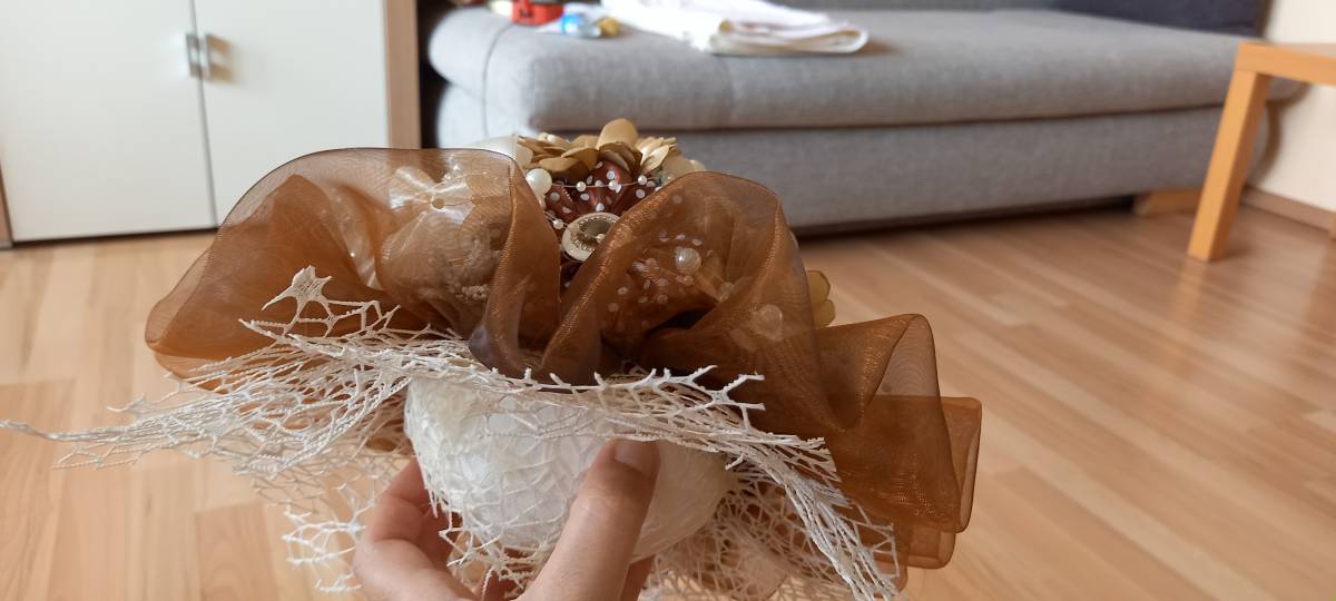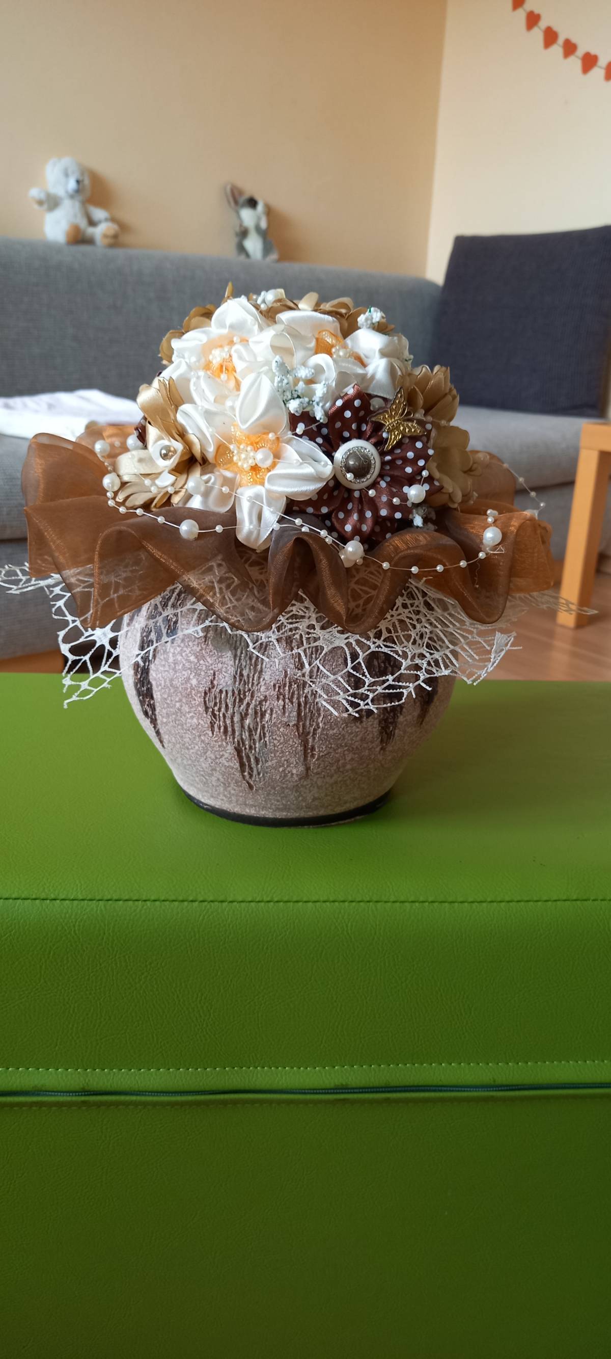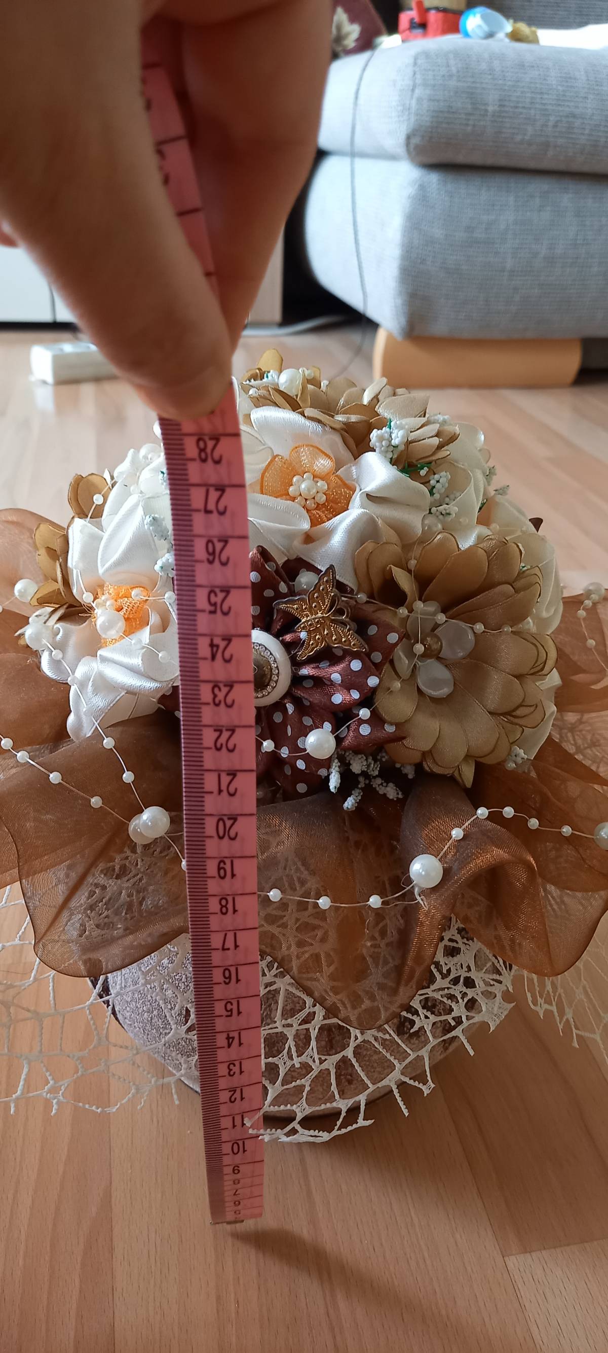 Viz foto, kyticka lepena na polystyren kouli. Sirka vazi 20 cm, vyska vazy 15 cm.