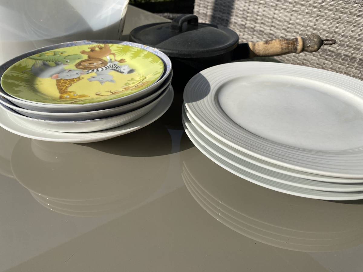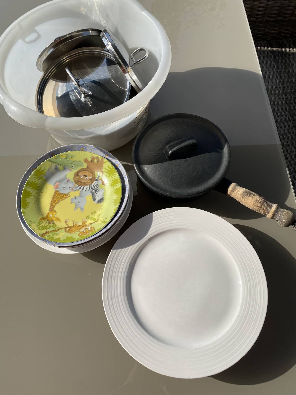 Pánev, malá, kvalitní, ale držadlo se musí opravit (pro kutily), talíře, třeba na chalupu, do práce, hluboké mají již světlejší barvu, Bílé ve velice dobrém stavu. Vše zaprášené, jinak v pořádku. Osobní odběr Praha 12 - Písnice. Spěchá.