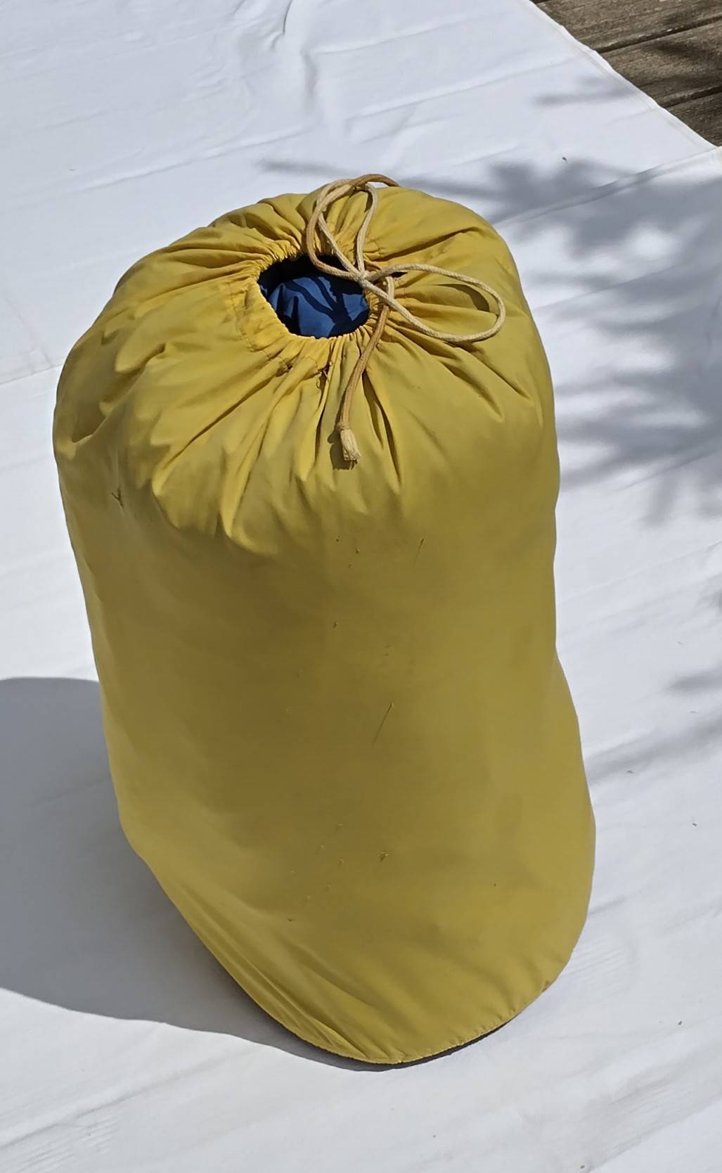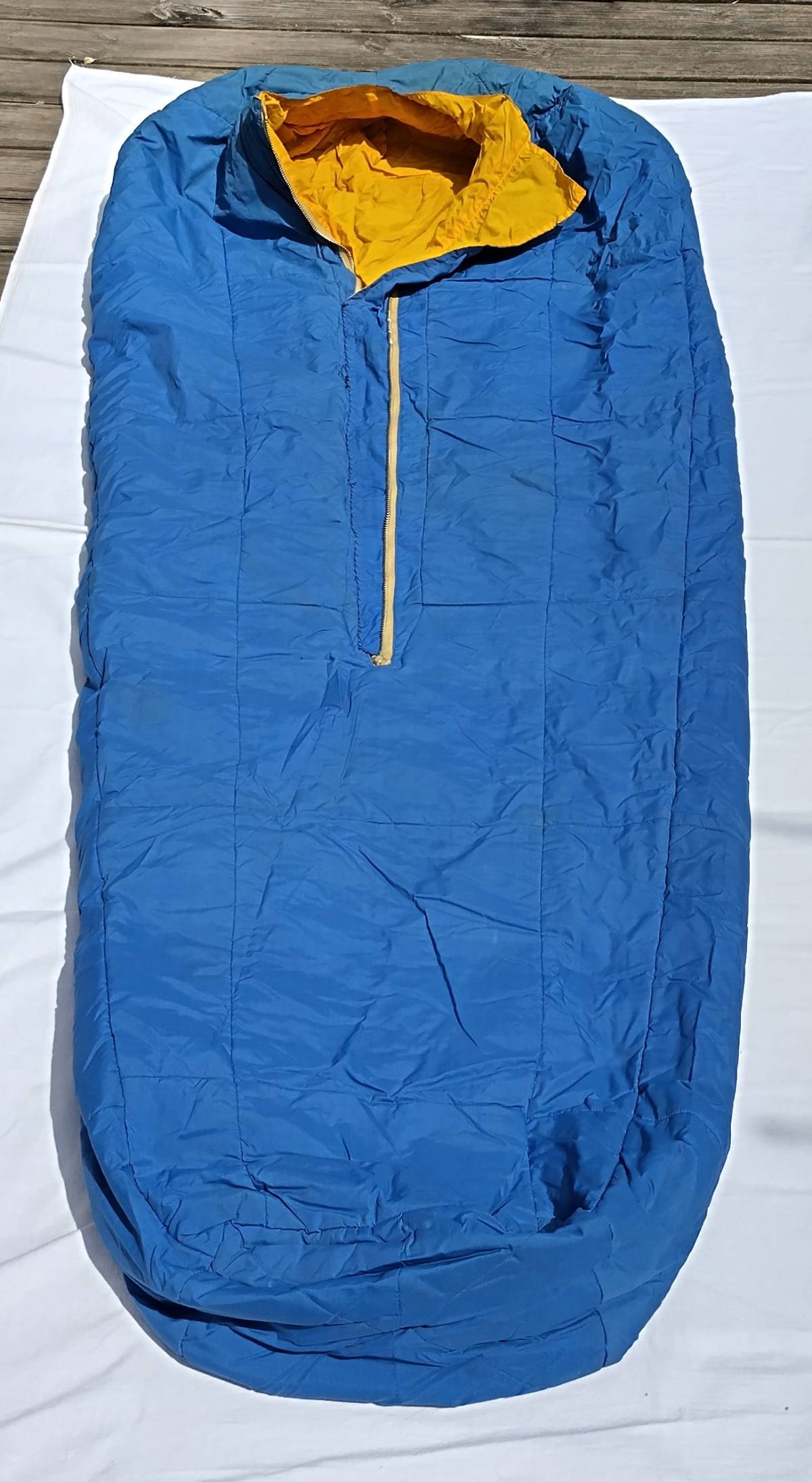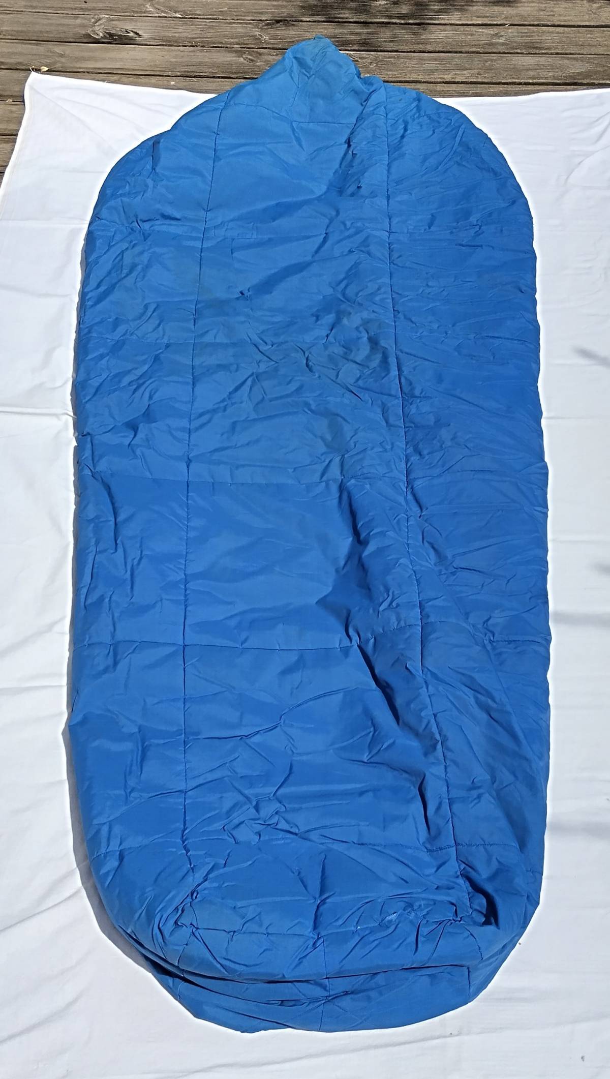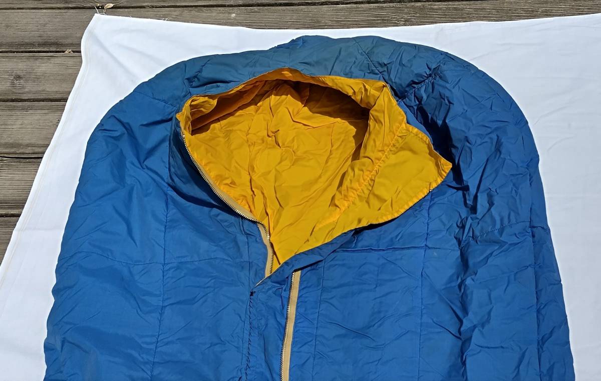 Spacák je po bratrovi, plus minus osmdesátá léta minulého století a tisíciletí. To víte, že by zasloužil čistírnu, a ano, zip není funkční, je sešitý a zbývá díra na vlezení dovnitř jen pro kluka.
