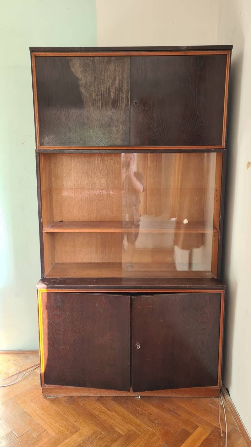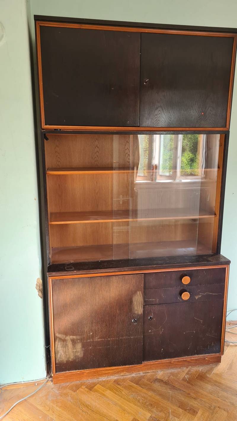 Zachovalá knihovna složená ze dvou 220 cm vysokých dílů o šířce 118 cm. Horní skříňky vysoké 58 cm lze sundat.