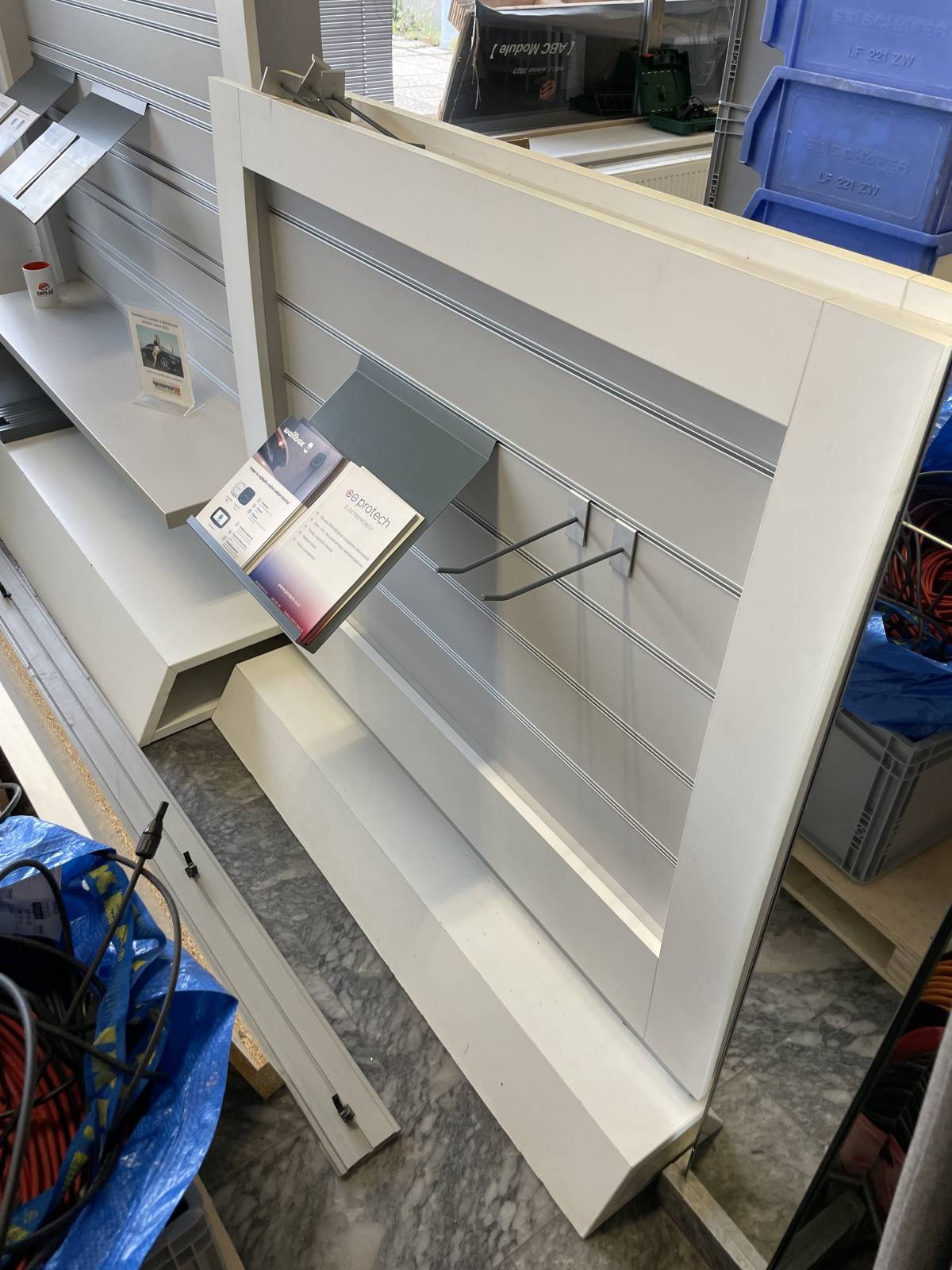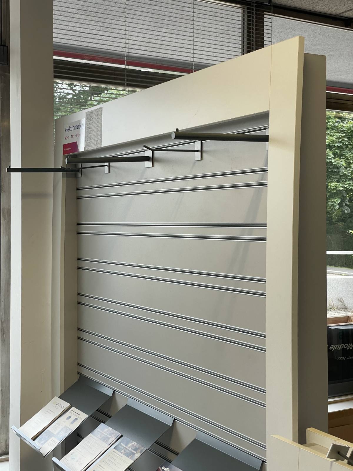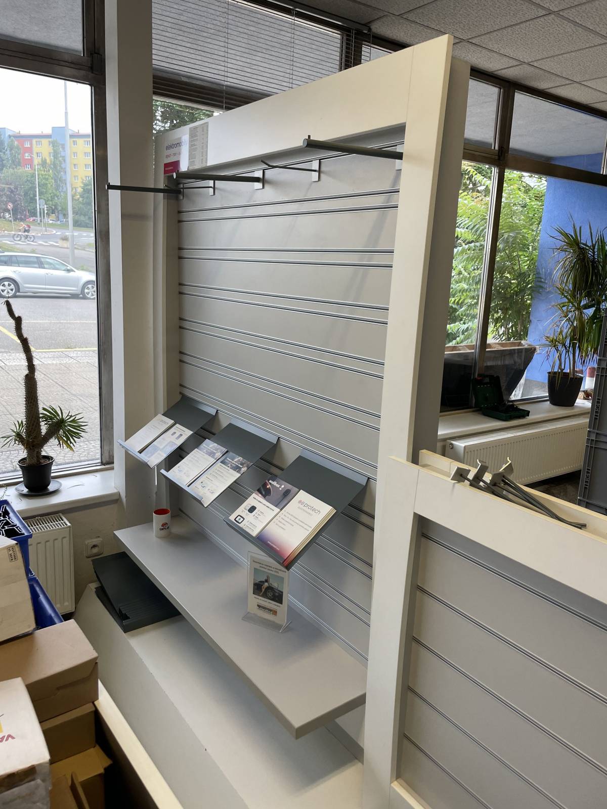 Kovové regály na letáky a kovové háčky – přemisťovatelné dle potřeby