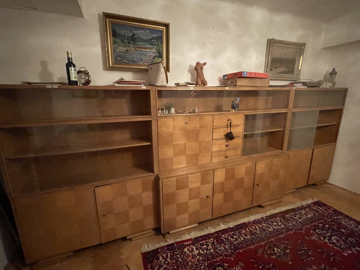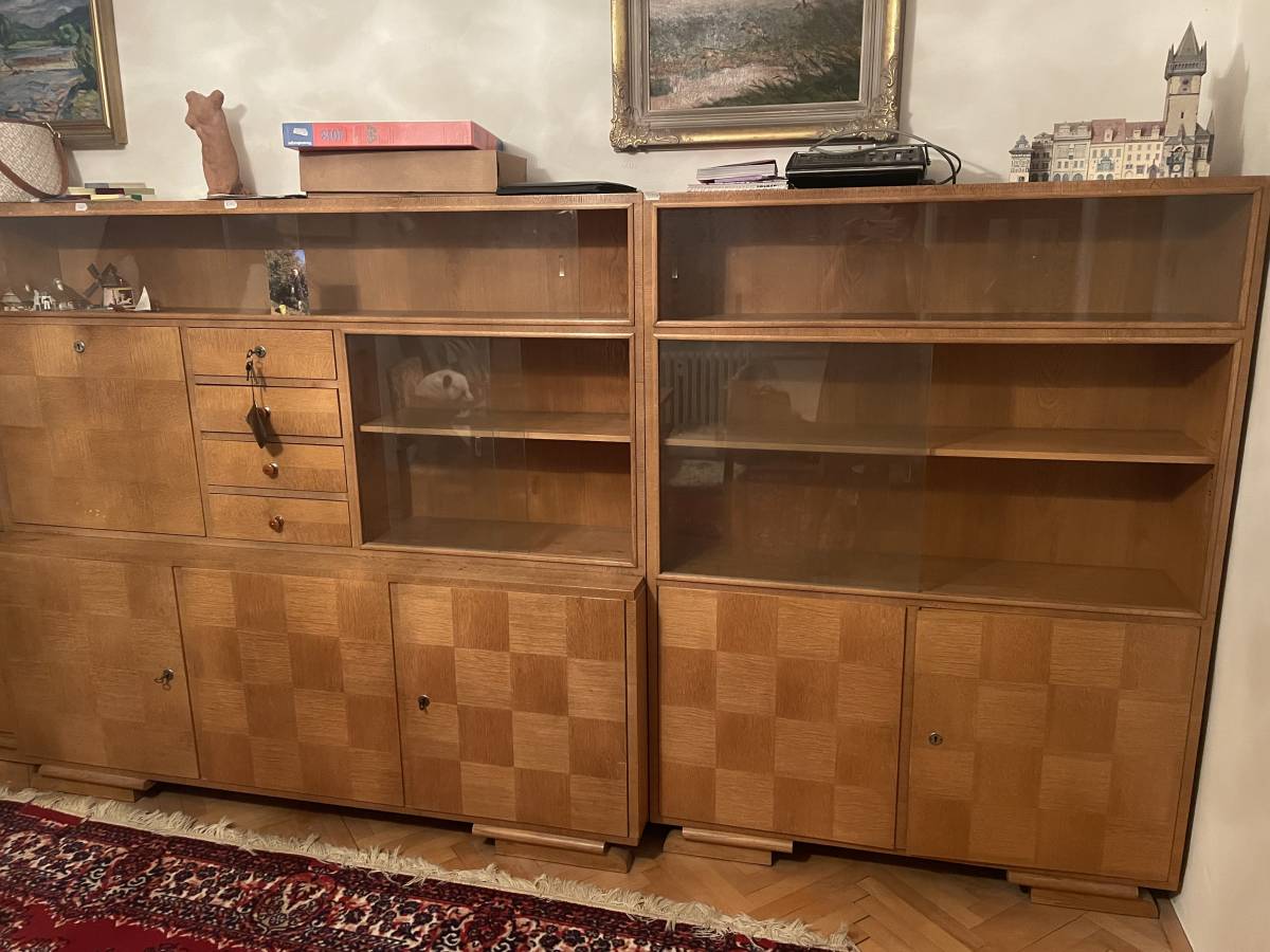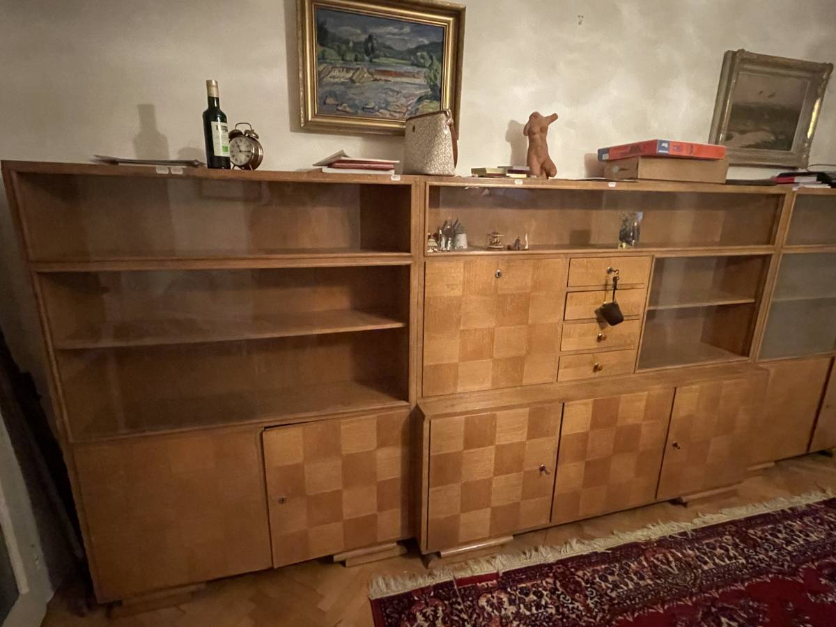 Daruji za odvoz: Nábytková sestava, vyrobená na zakázku 1948, návrh Ing Arch Ladislav Rydval, rozdělená na 3 části. Výška celé sestavy 158,5cm. Levý a pravý díl 118 x 29. Střed 178 x 29 (spodek +10cm). Nutný vlastní odvoz, ideálně co nejdříve. Ve stejném designu nabízím i pohovku