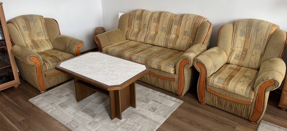 Za odvoz daruji 2 křesla (š90,h95,v100) a rozkladací gauč (š190,h95,v100 - lůžko 200x150) a k tomu konferenční stolek (š70, d110, v53). Možno odvézt pouze jako komplet, nutno ve dvou silných lidech (1. patro v panelovém domě). Běžné opotřebení čalounění, bez prosezení nebo roztrhání.