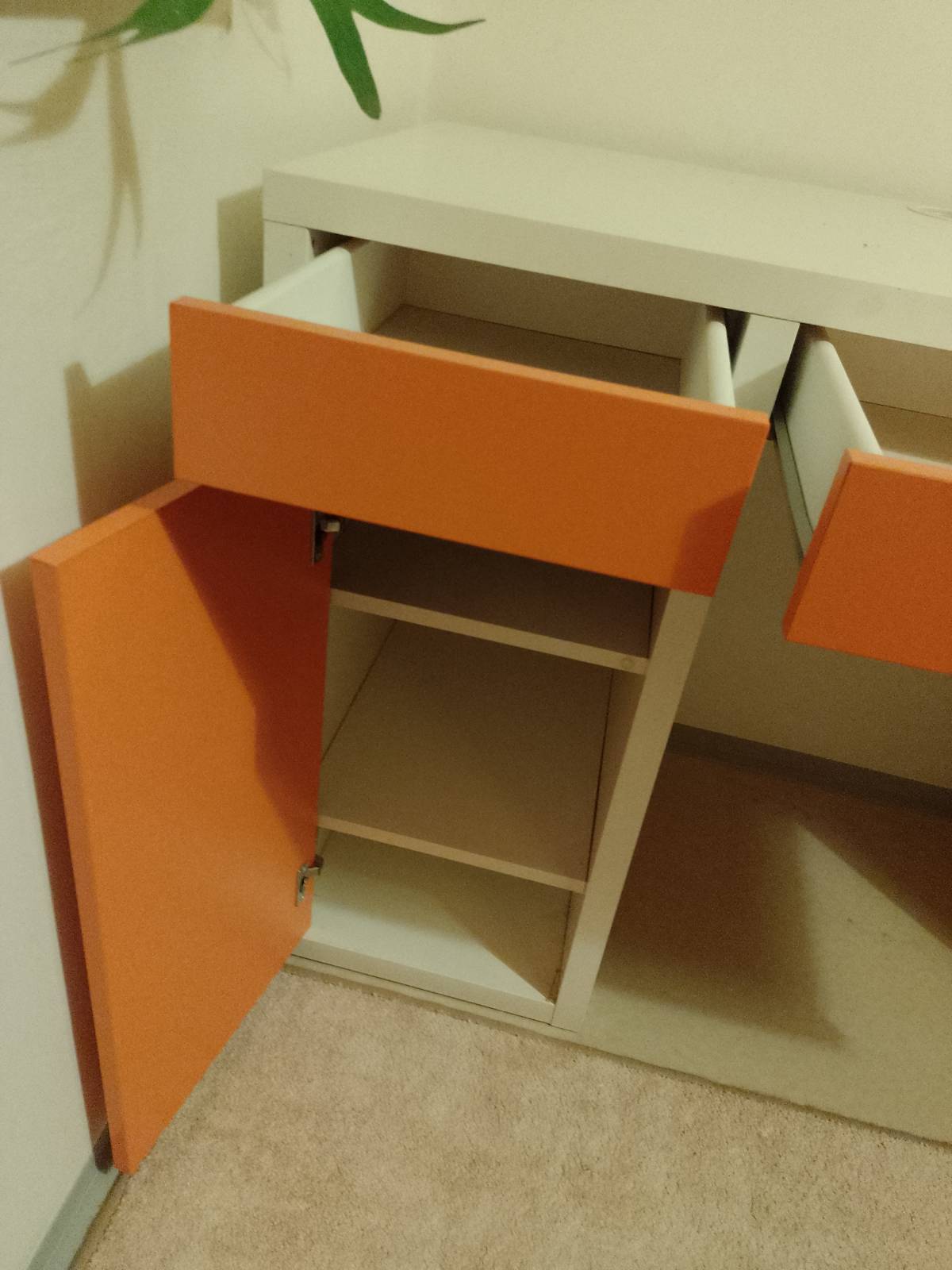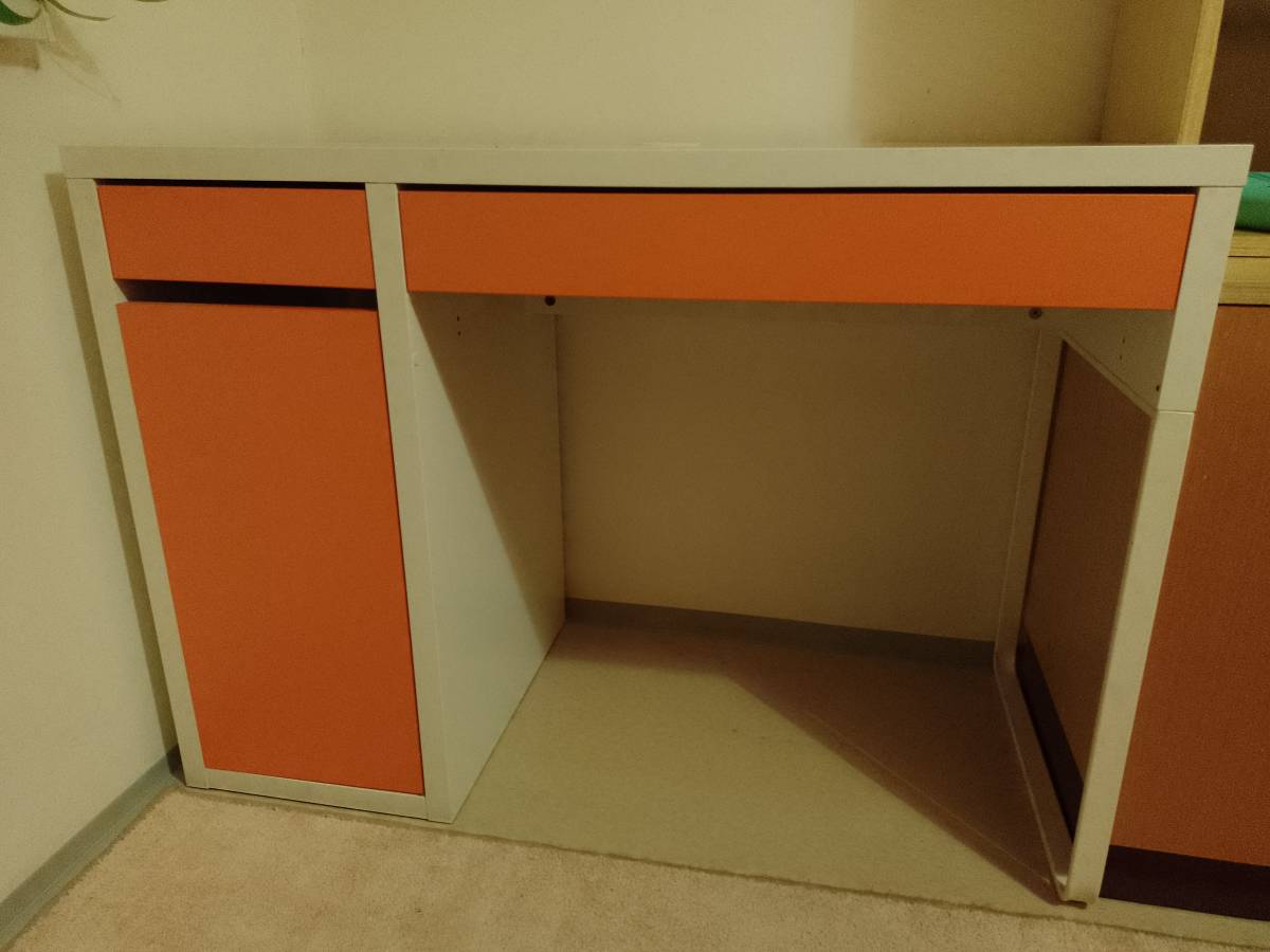 Daruji za odvoz stůl s oranžovými detaily. Je z IKEA, poškrábaná deska.