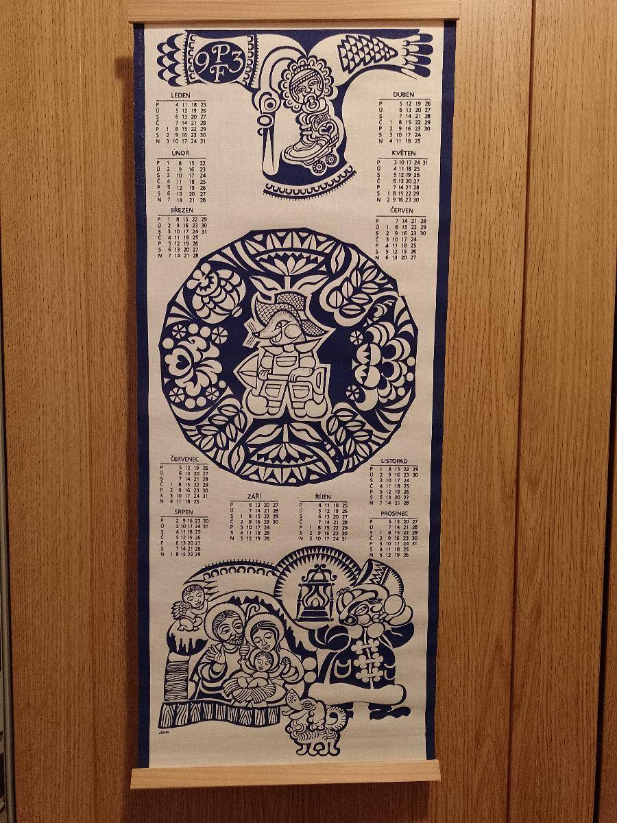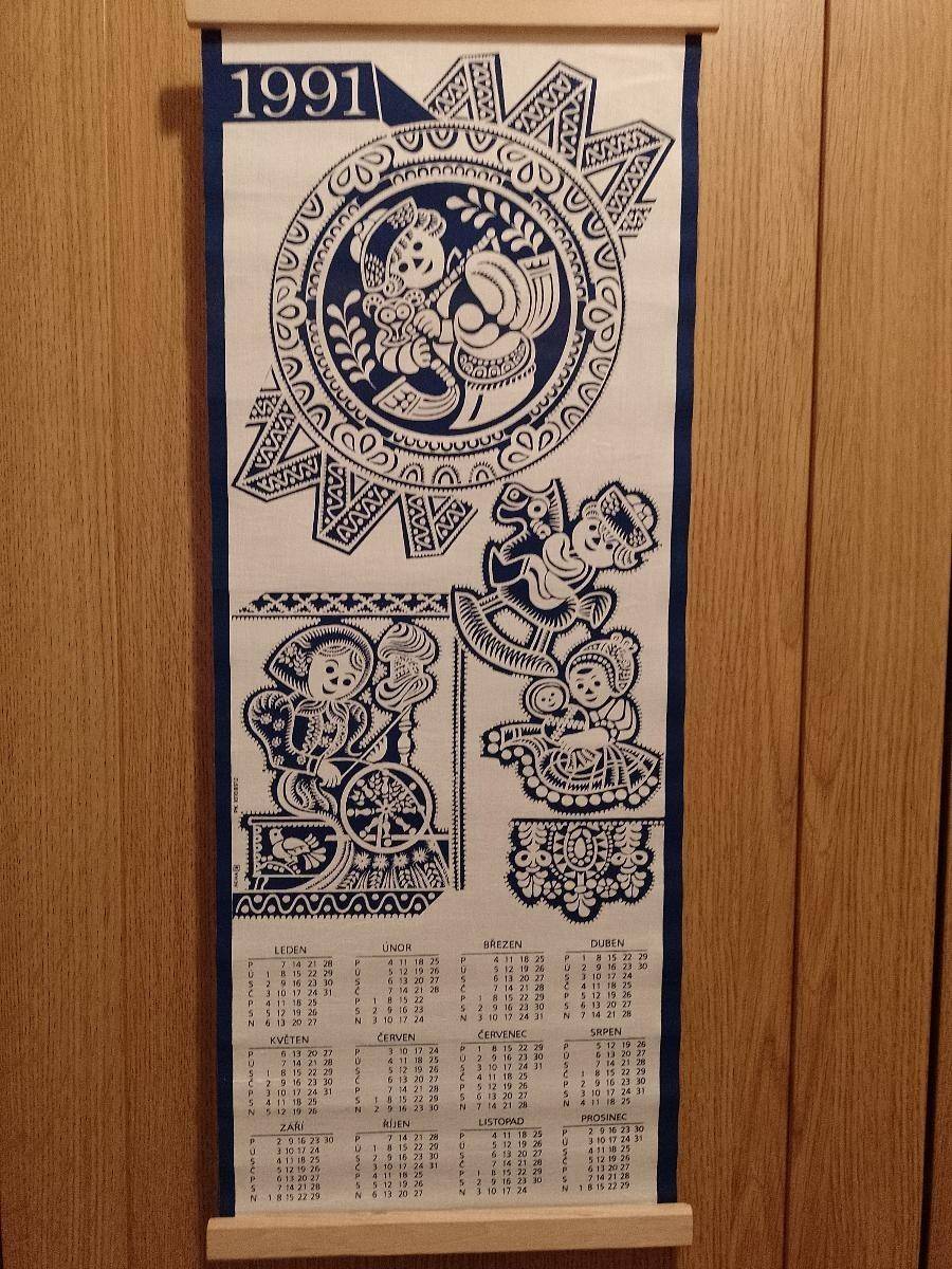 Daruji za odvoz závěsné textilní kalendáře pro roky 1991 a 1993, zakoupeno v prodejně Dílo, autor Josef Ladislav Jícha.