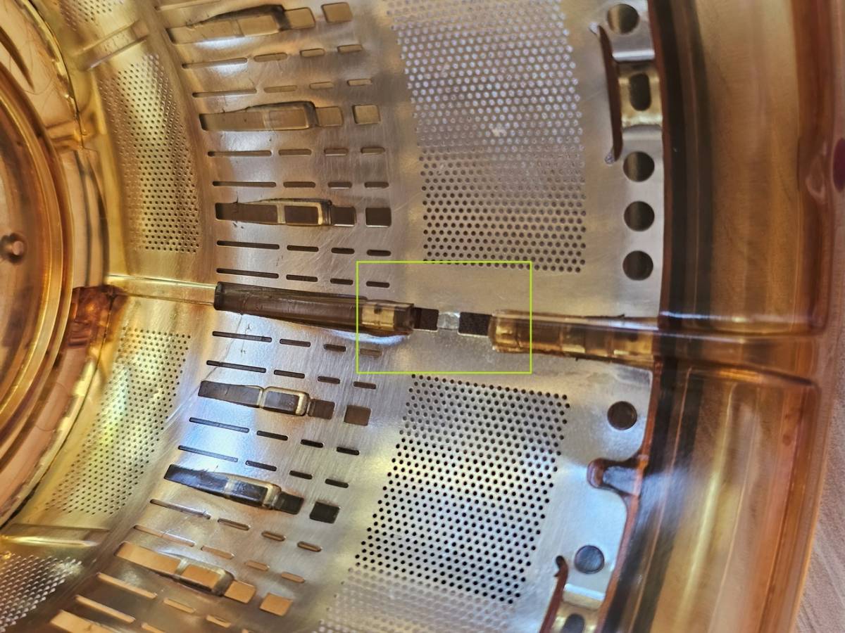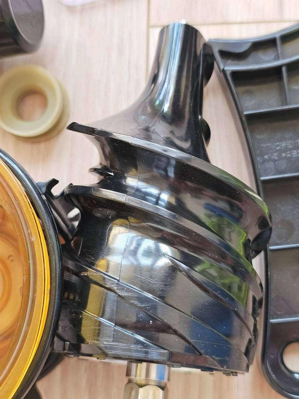 Část odštavňovacího síta je vylomená (viz foto), takže prolézají drobné kousky dužiny do šťávy.