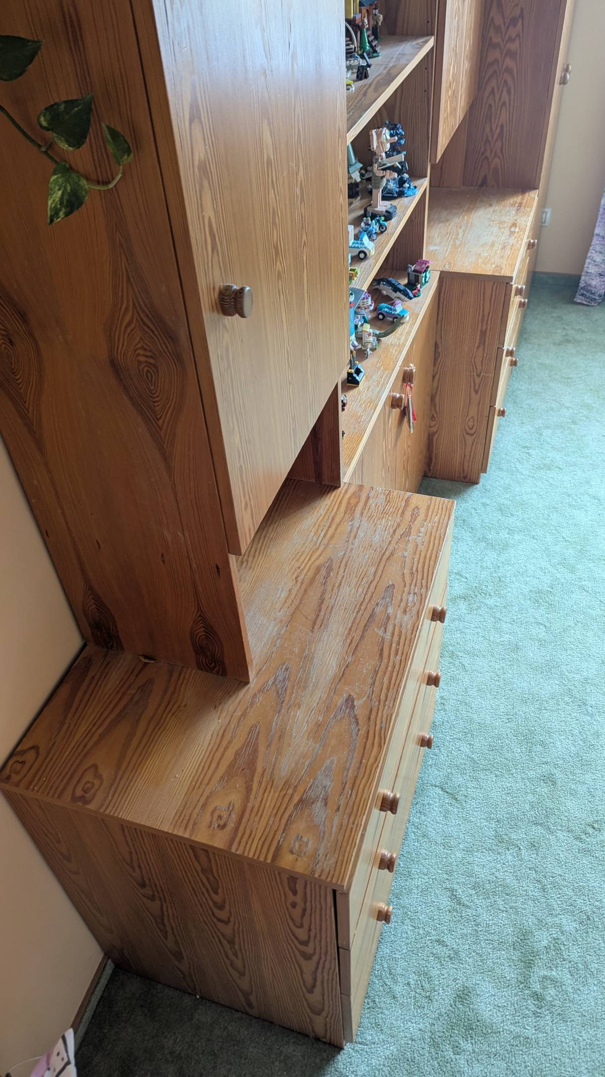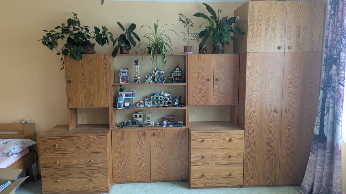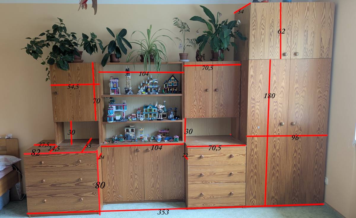 Daruji za odvoz skříňovou stěnu. Jednotlivé skříně možno užívat i samostatně. Borovicová dýha.