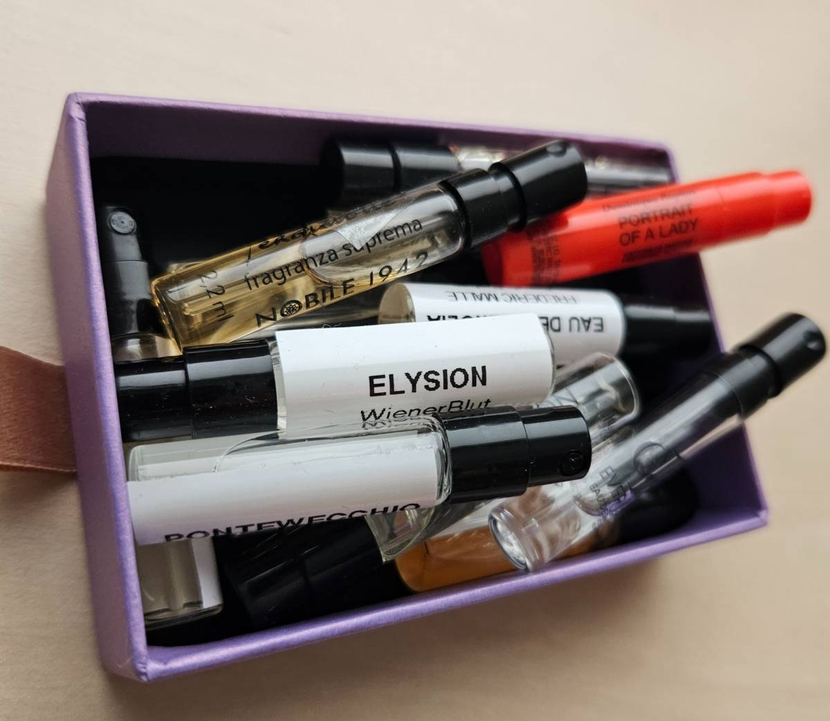 Vzorky značkových parfémů v různém stavu odstříknutí. Většina koupená minulý rok.