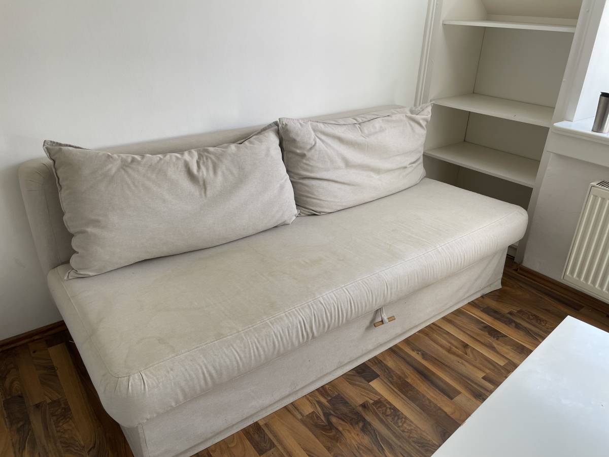 Pohovka je plně funkční, snadno se rozkládá, má velký úložný prostor. Potah je látkový, na některých místech s viditelnými skvrnami (viz foto) ideální k přečalounění nebo pro nenáročné uživatele, na chalupu či do studentského bytu.