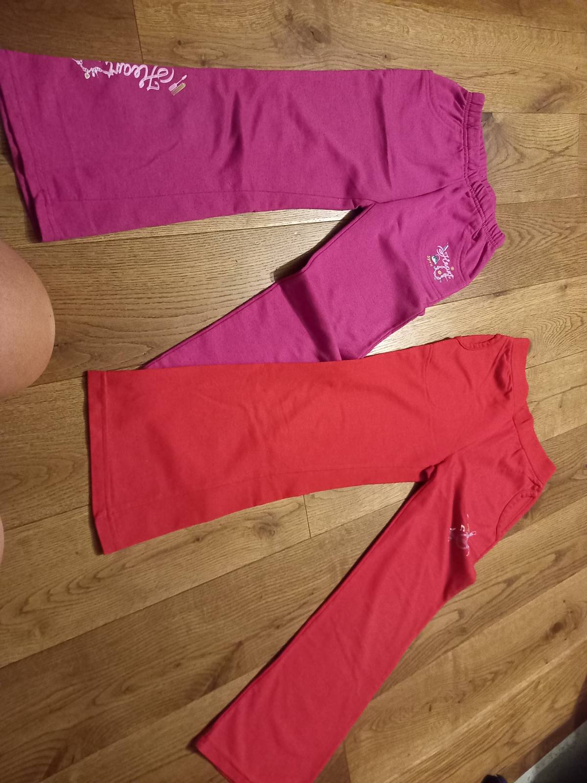 Daruji za odvoz dvoje dívčí tepláky cca na 6-7 let,červené je nutno zašít v rozkroku,jinak OK. Nohavice mírně do zvonu.