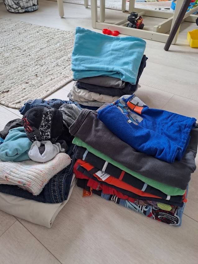 Trička krátký, dlouhý rukáv, kraťasy, dlouhé kalhoty, ponožky, tílko. Ještě jsem doplnila o dvoje šusťáky na ven, jedny manšestrové a jedny pyžamové kalhoty a dvoje tepláky, které už jsem nefotila. Vyzvednutí na Novodvorské nebo Lounsko.