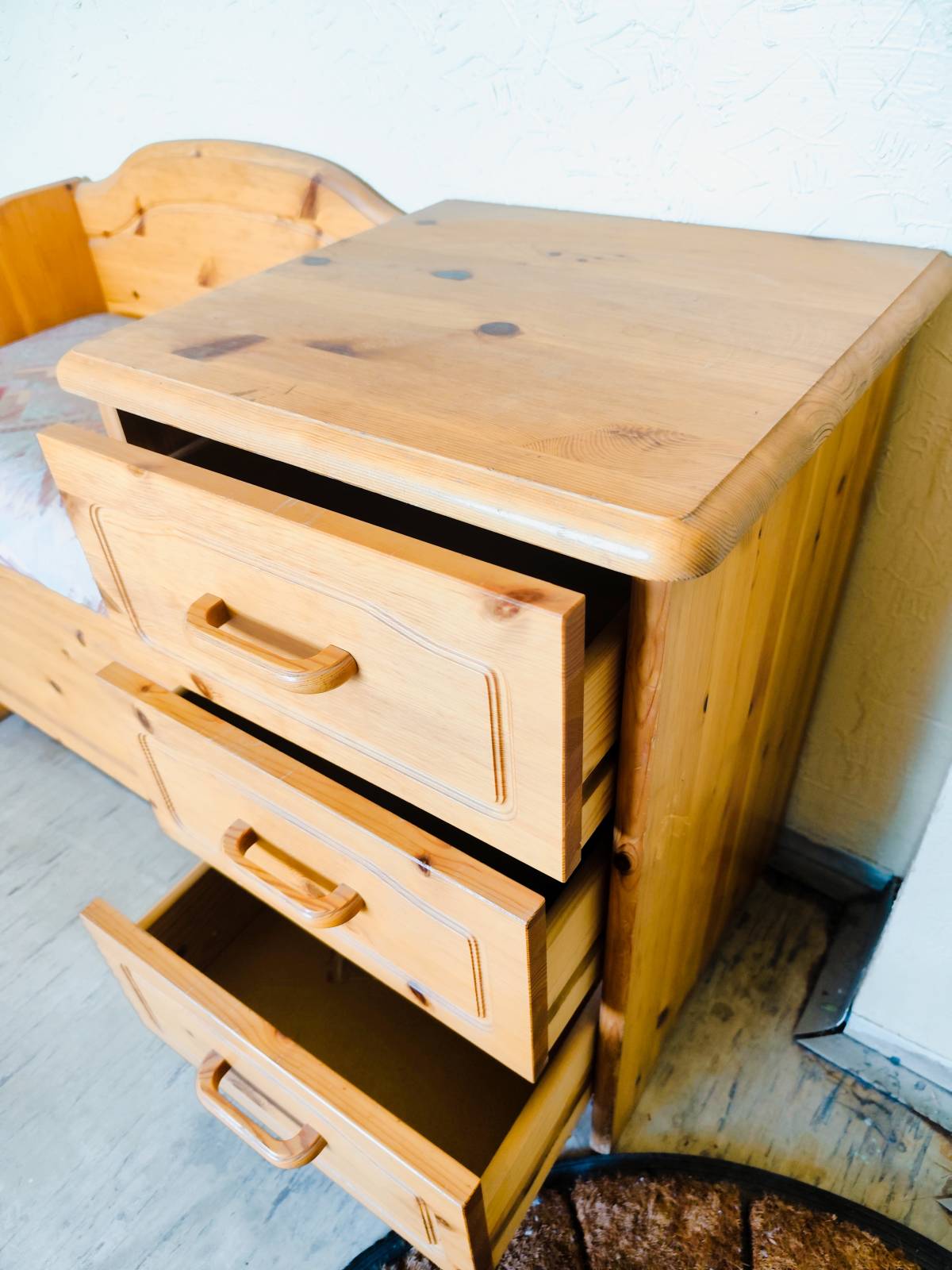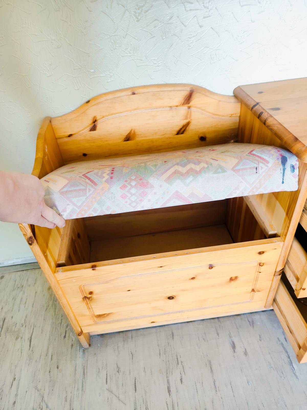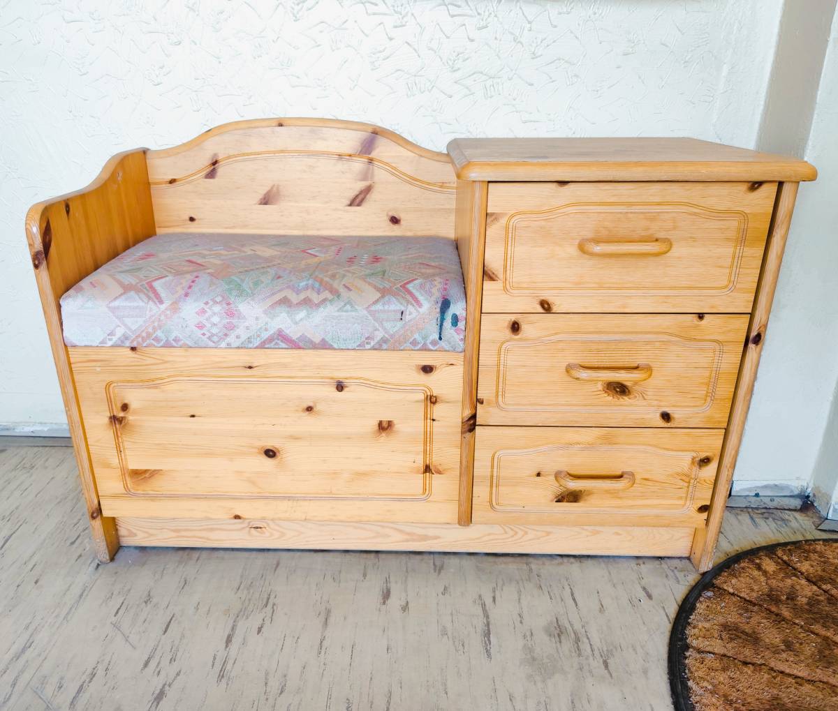 Daruji za odvoz dřevěnou skříňku s úložným prostorem, třemi šuplíky a sedátkem. Ideální do předsíně na obouvání.