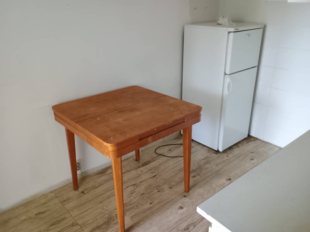 Skřínka, židle, stůl, regál a lednice