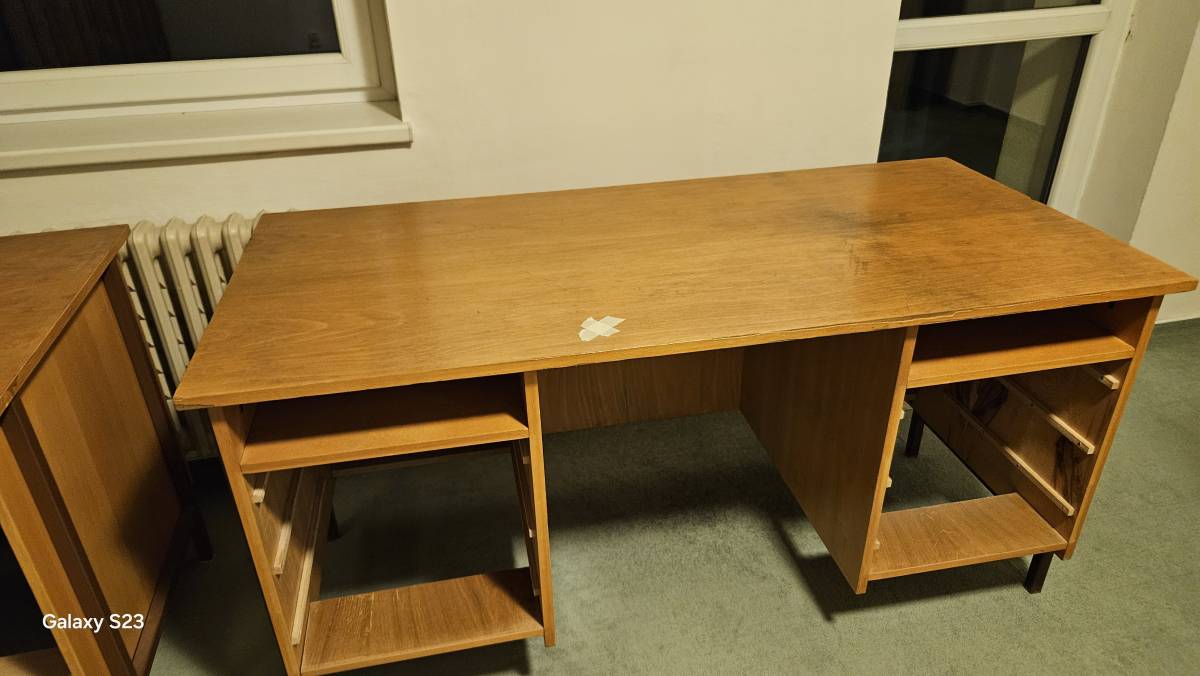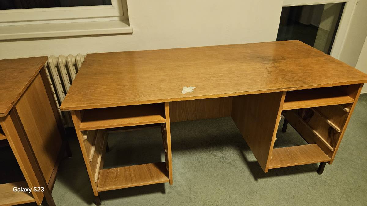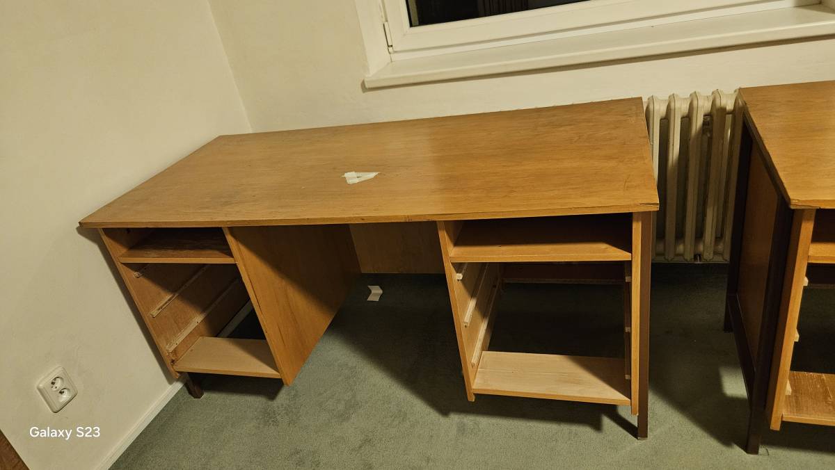 Daruji za odvoz dva bytelne a prostorne kancelarske stoly vcetne supliku. Supliky mam v garazi, tak nejsou na fotce, ale stejne jako stoly jsou pekne, bytelne, jen uz maji patinu. Rozmery: sirka 150 cm, vyska 76 cm, hloubka 70 cm. Jsou k dispozici do 10. Zari, pak je odvezu do sberu