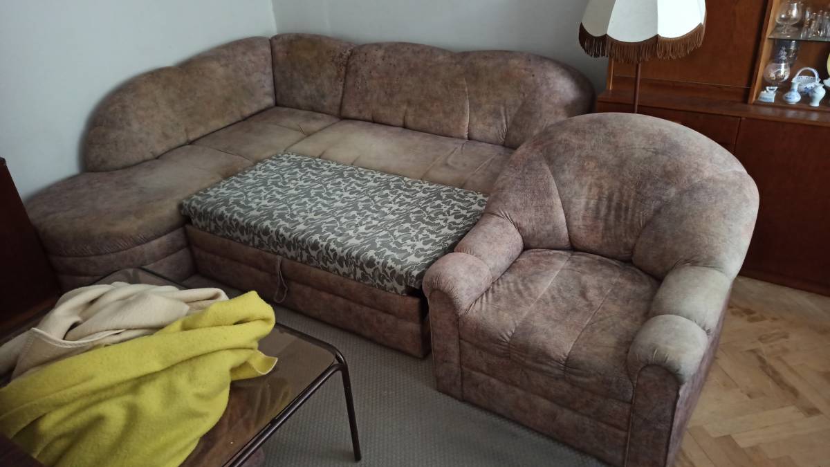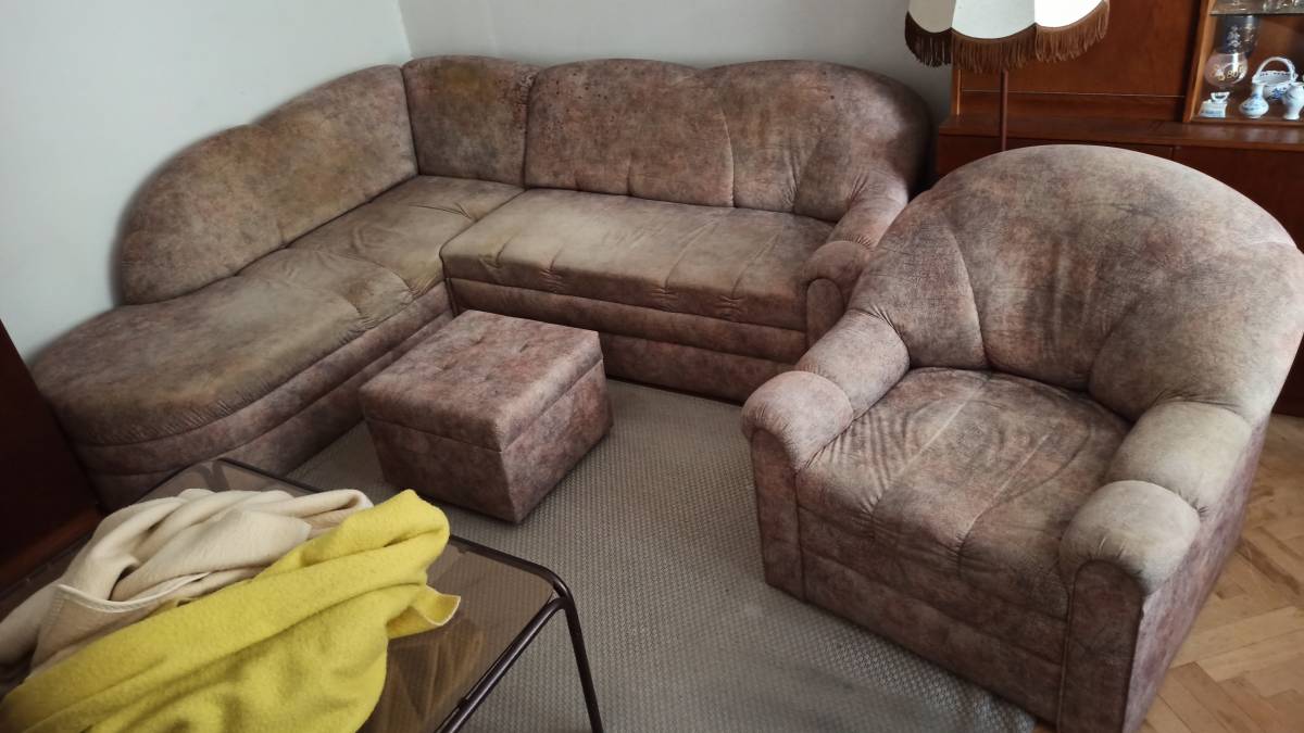Daruji za odvoz starou rozkládací pohovku, křeslo a taburetek. Na potahu pohovky jsou skvrny. Celkový rozměr pohovky 240x200cm.