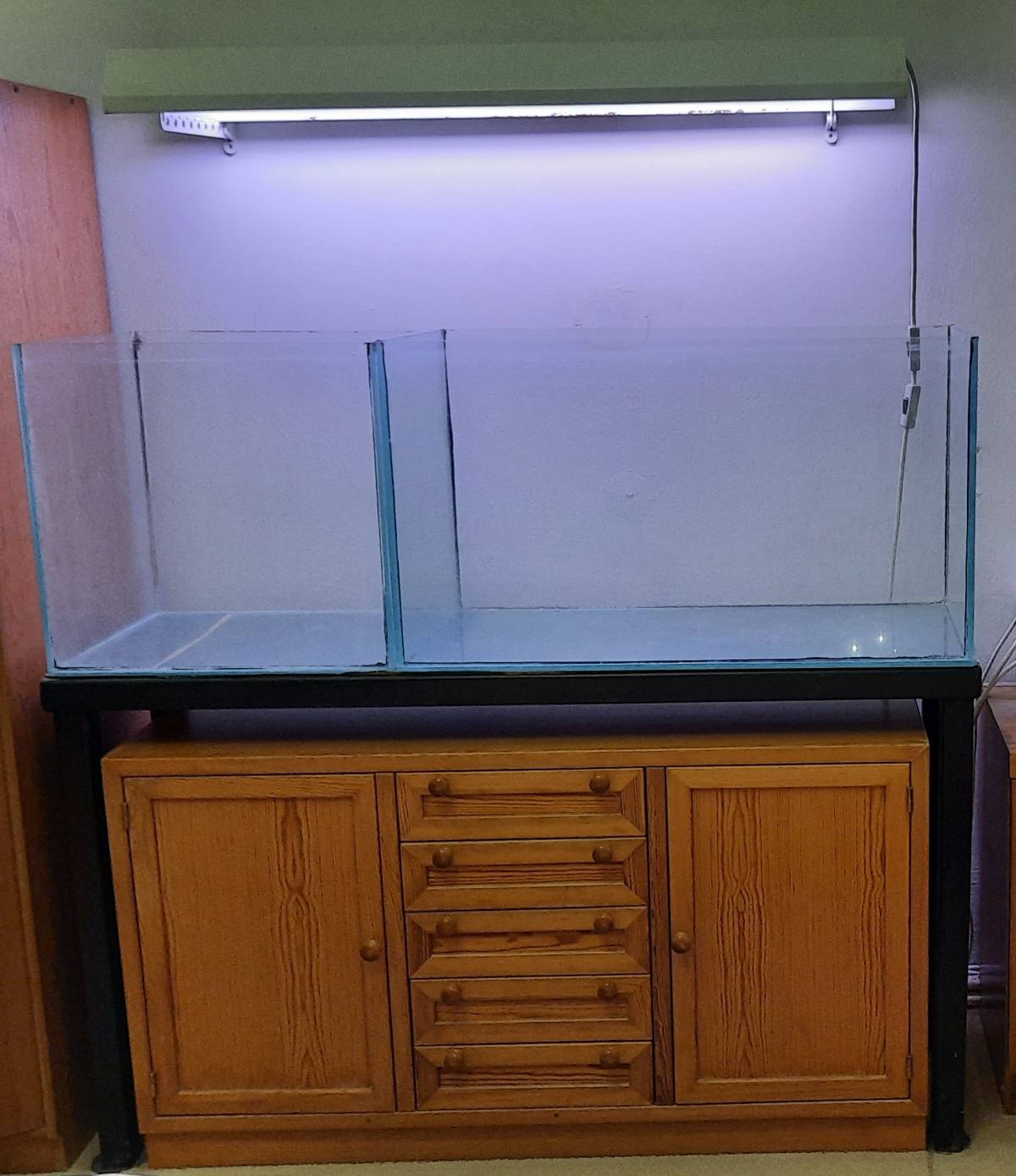Daruji za odvoz akvarijní komplet - dvě lepená akvária s kovovým podstavcem, světlo nad akvárium se zářivkou a kompletní vybavení