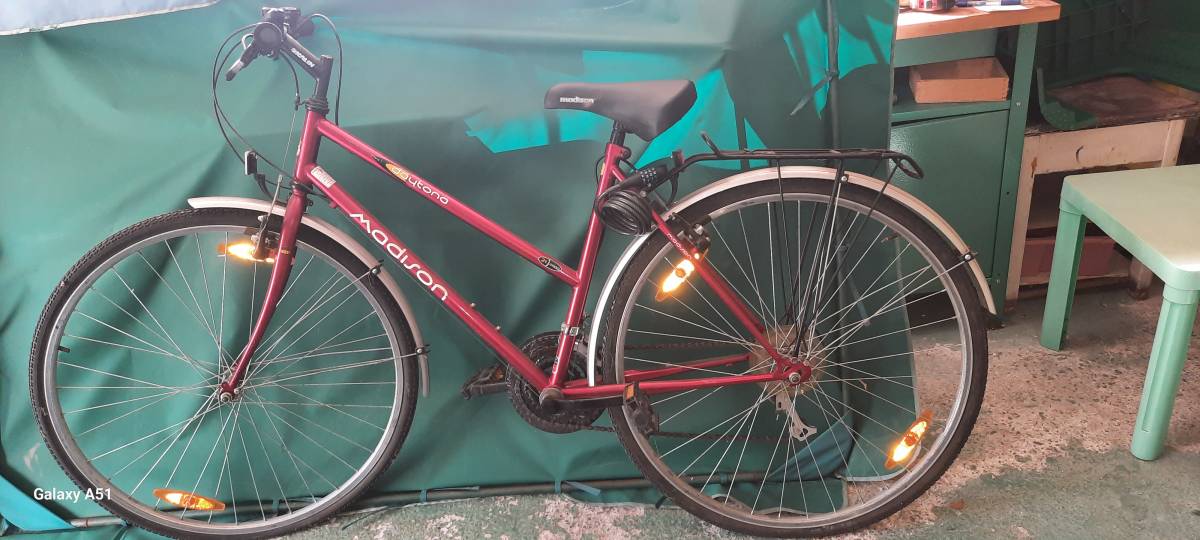 Nabízím za odvoz starší dámské jízdní kolo zn. MADISON, červené barvy, průměr kola 60,5 cm.
