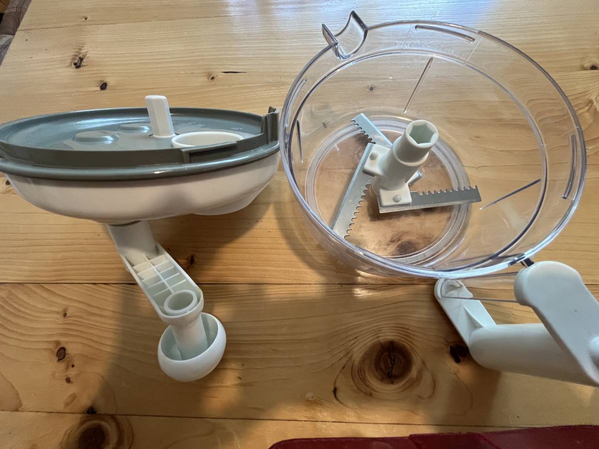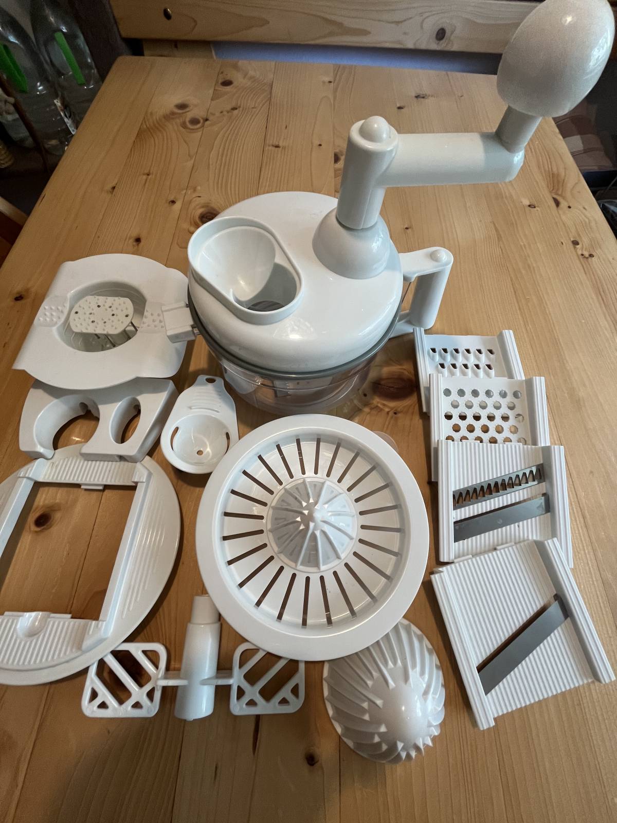 Malý pomocník do kuchyně. Nepoužívaný. Možnosti: míchá, seká, krouhá, strouhá, odšťavnovač citrusů, odděluje bílek od žloutku.