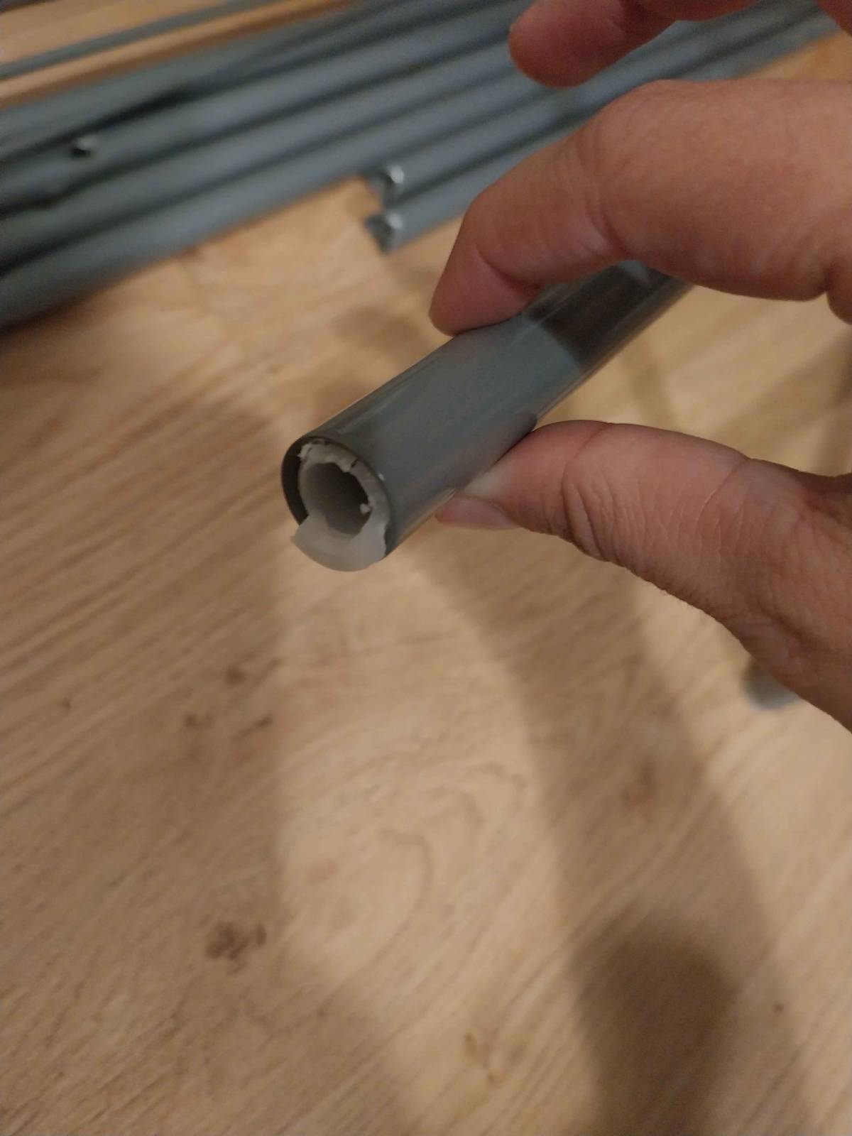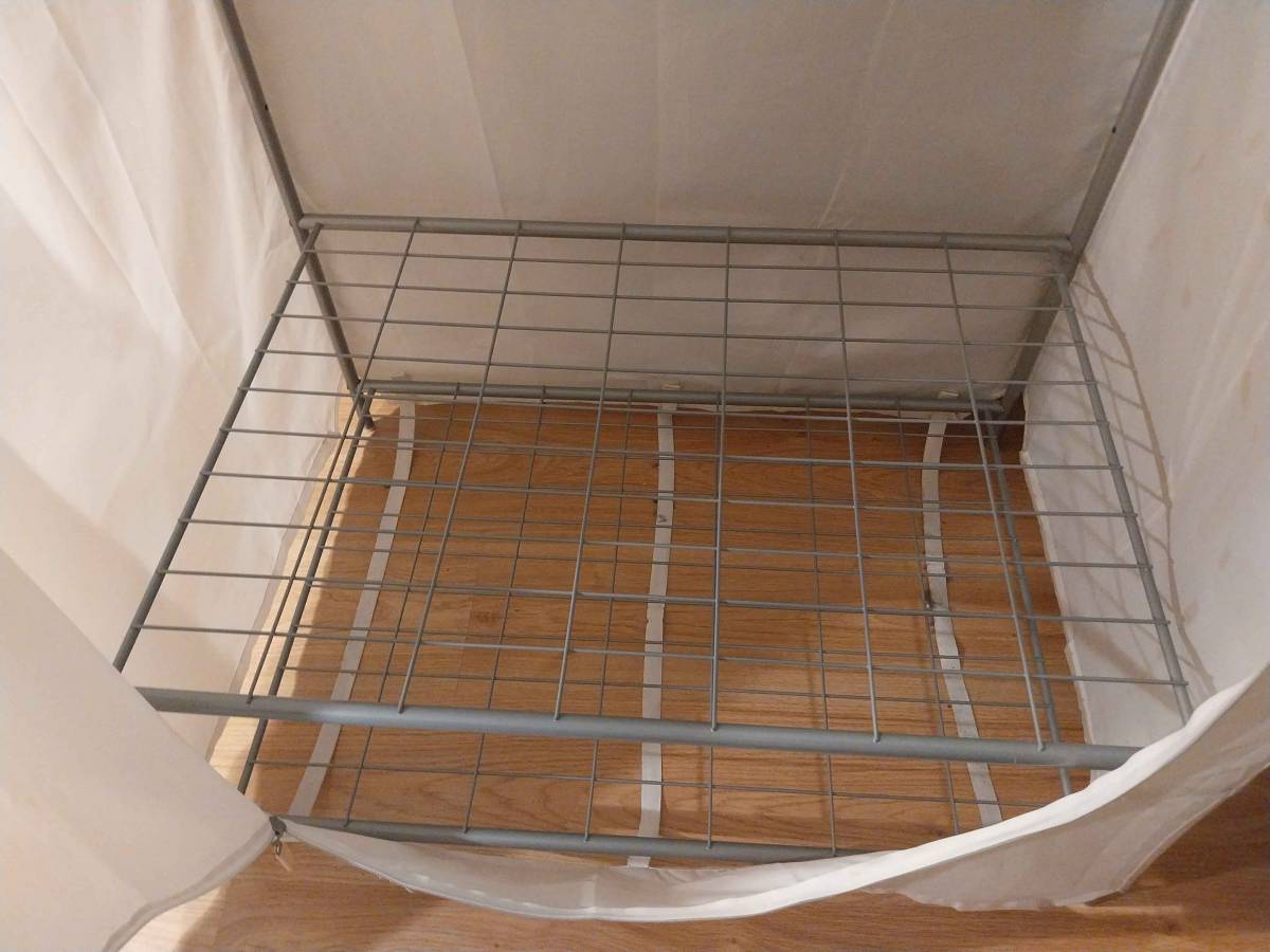Skříň je plně funkční. Látka je ze strany trochu zažloutlá a zašpiněná - je možné, že po vyprání skvrny sejdou. Ve vrchní části rohových tyčí je rozdrolený plast, do kterého se zasunuje vrchní rám (viz. poslední obrázek), takže tam bude třeba doplnit jiný materiál, aby vršek nevrzal a nehoupal se.