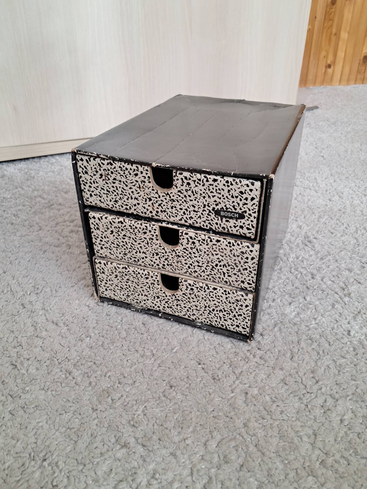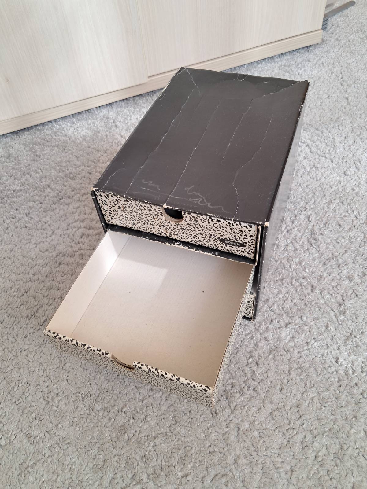 Daruji za odvoz Krabici s přihrádkami, šuplíky, je papírová. Především ze shora je už oškrábaná, viz. foto. Šuplíčky ale fungují v pořádku, kdyby si člověk třeba polepil.