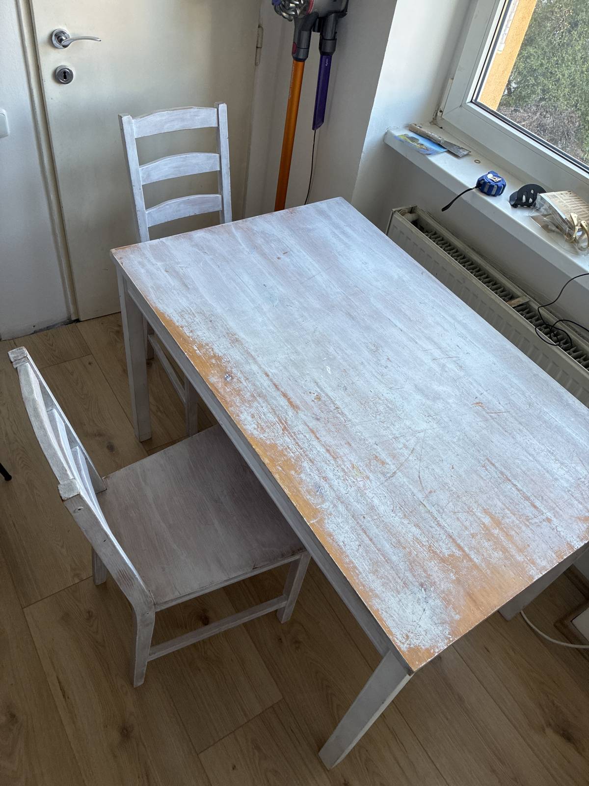 Darují dřevěný jídelní stůl a k němu 2 židle, vše IKEA. Nese známky opotřebení ale není nějak poničeny, svůj účel plní, kdyby se obrousil a natřel, tak může stále vypadat k světu. Rozměry 118x74x74