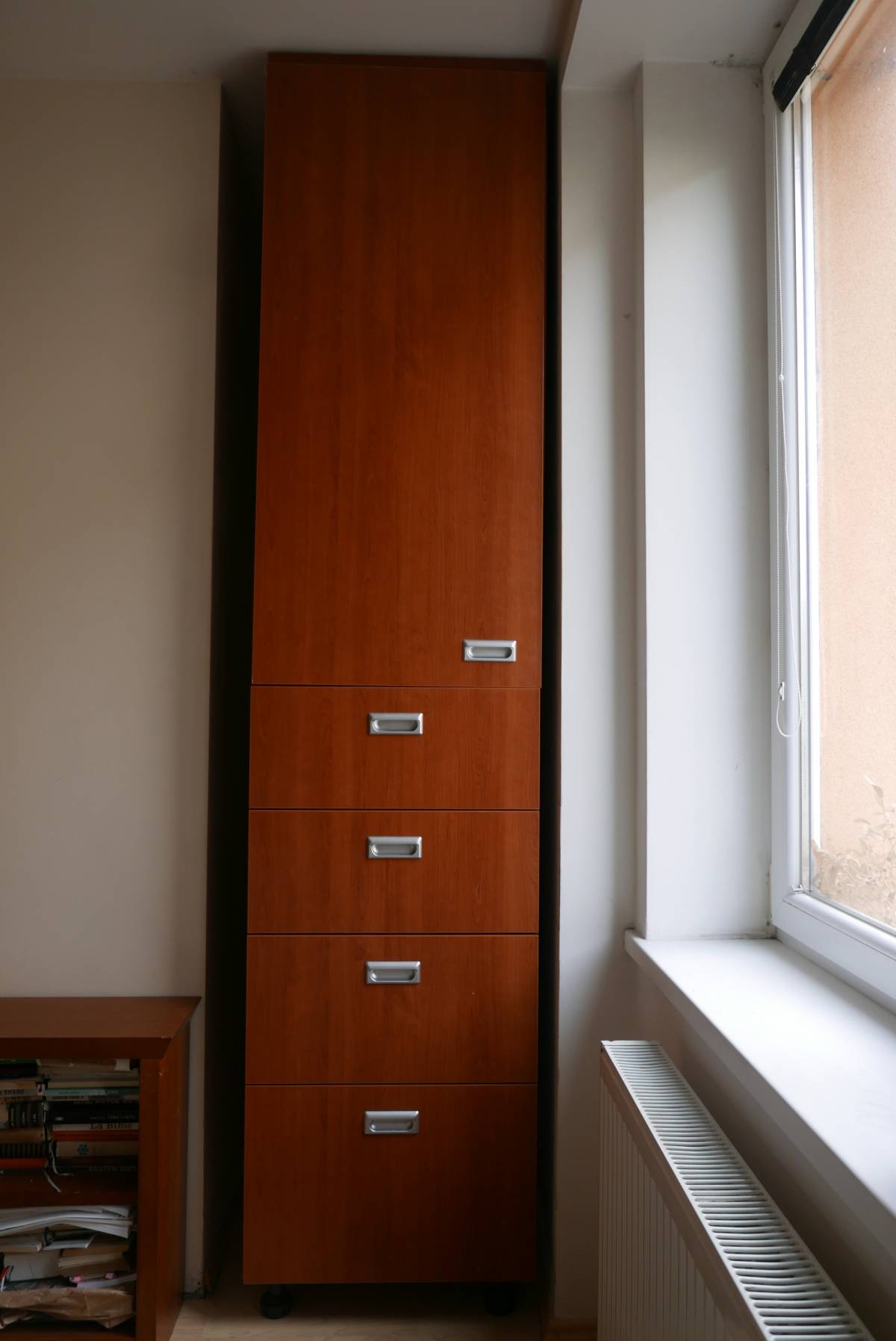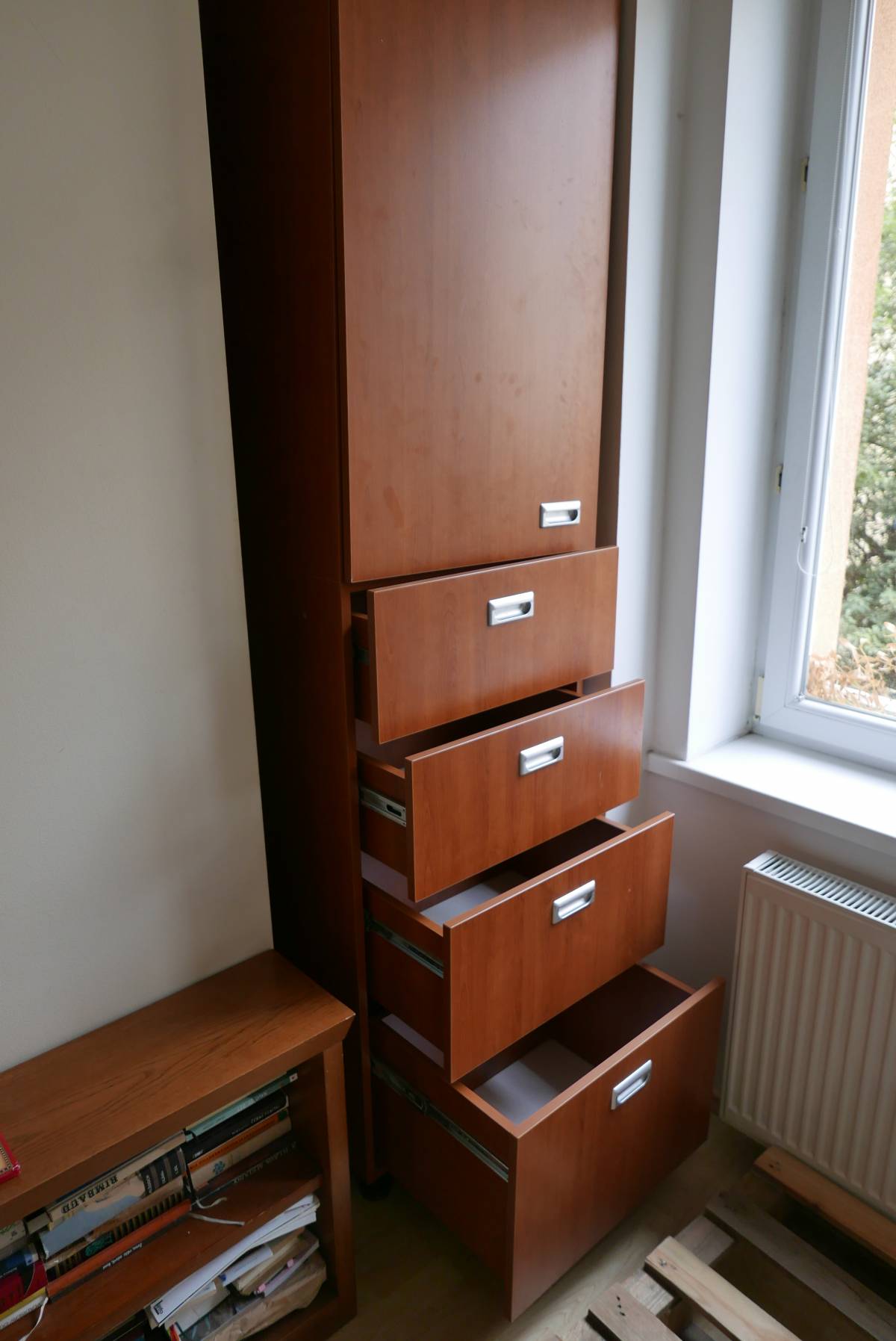 Skříň má čtyři zásuvky a v horní části čtyři police.